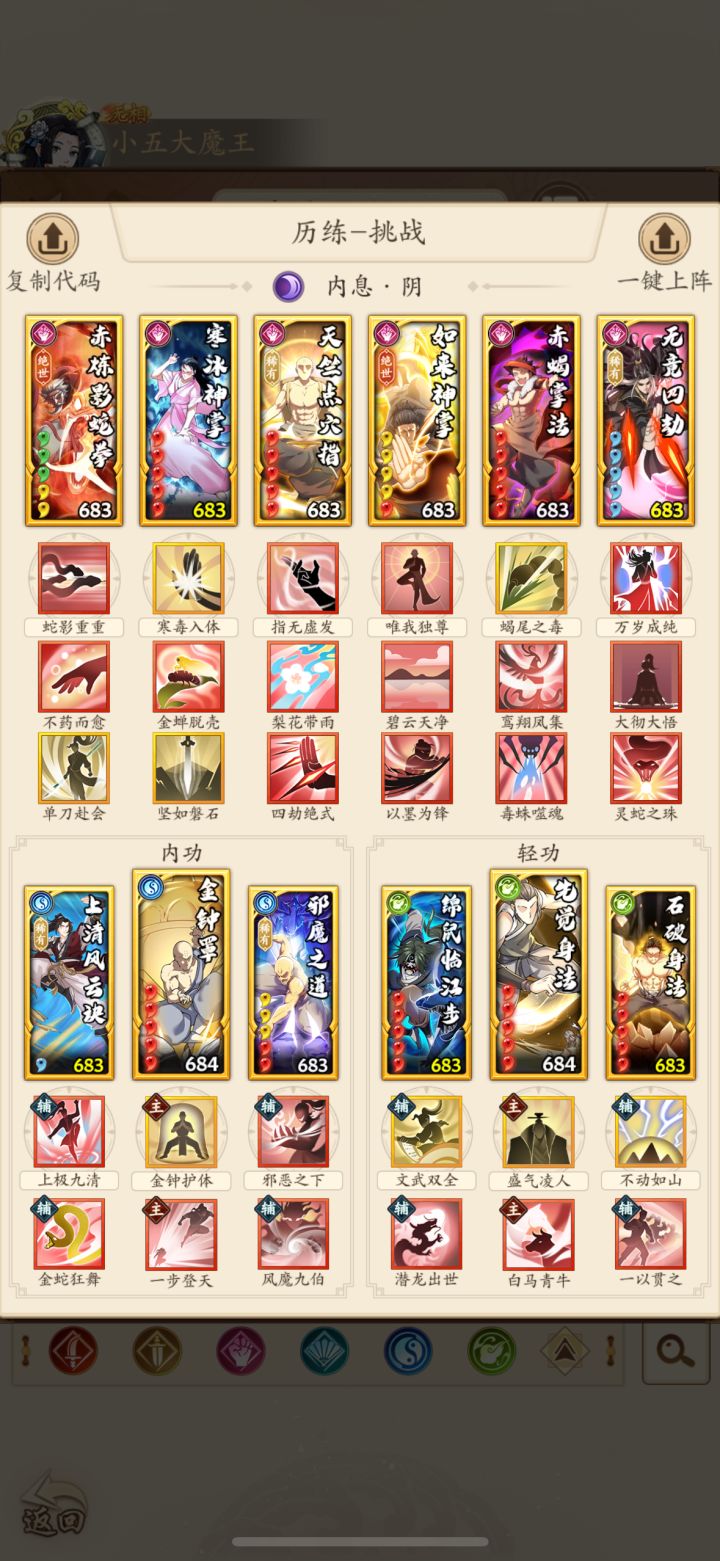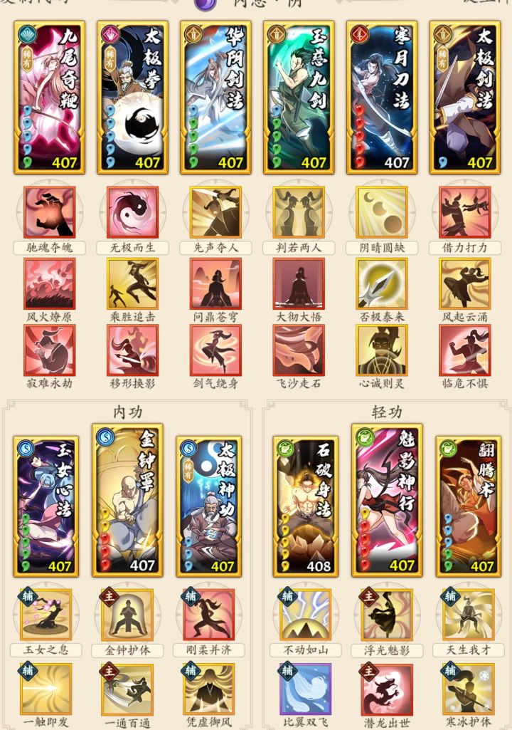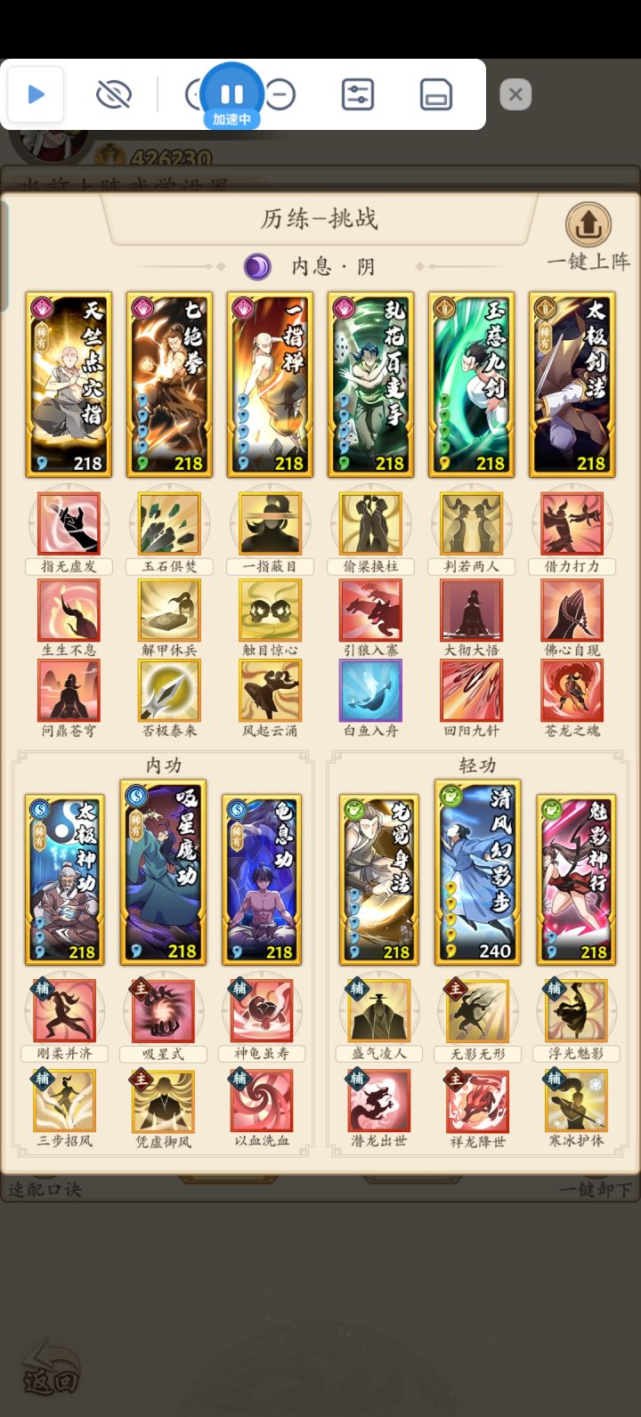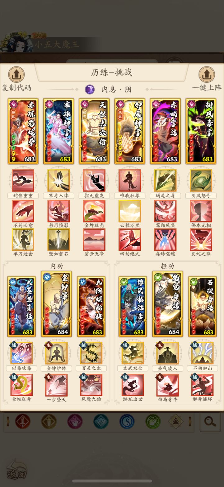 很多人都在问游龙阴刀前期能不能玩儿?经过我本人今天花费了7个小时的试招。终于试出一套游龙阴刀最初版本。 开局一如既往的三连惊,(对方一般会在第四或者第五位武学放置先手)所以用绝冥提供后手收割和拉条。 楼兰给绣春刀招式出手率15%.和破绽降低20%防御。 绣春刀通过泰然自若取消一切先手控制,再结合豁然通透10%触发先手和20%伤害。 绣春刀最后总几率为95%出手率再配上心诚则灵总共40%的招式伤害。