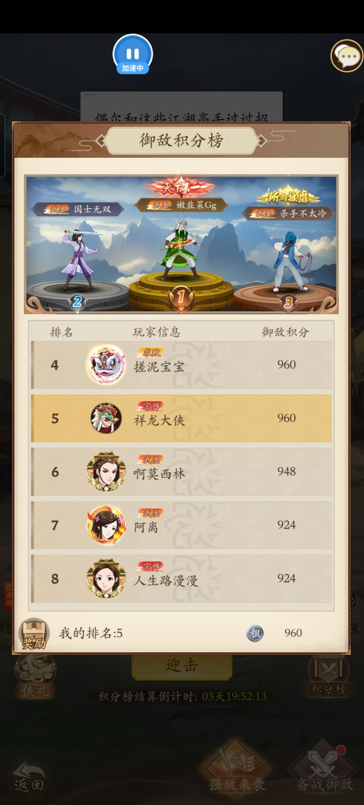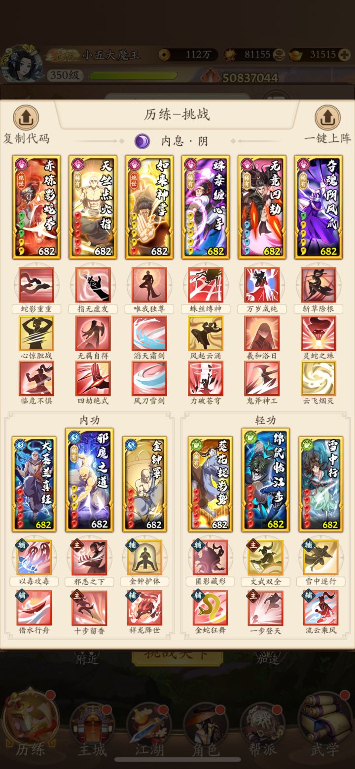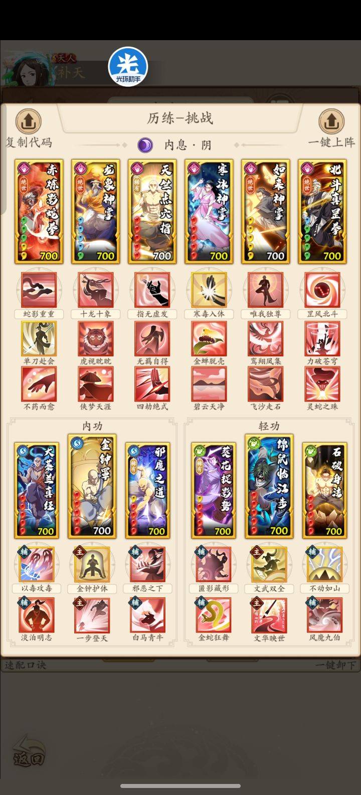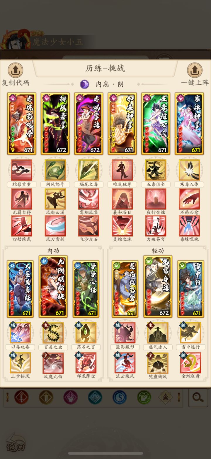 很多人都在问游龙阴刀前期能不能玩儿?经过我本人今天花费了7个小时的试招。终于试出一套游龙阴刀最初版本。 开局一如既往的三连惊,(对方一般会在第四或者第五位武学放置先手)所以用绝冥提供后手收割和拉条。 楼兰给绣春刀招式出手率15%.和破绽降低20%防御。 绣春刀通过泰然自若取消一切先手控制,再结合豁然通透10%触发先手和20%伤害。 绣春刀最后总几率为95%出手率再配上心诚则灵总共40%的招式伤害。