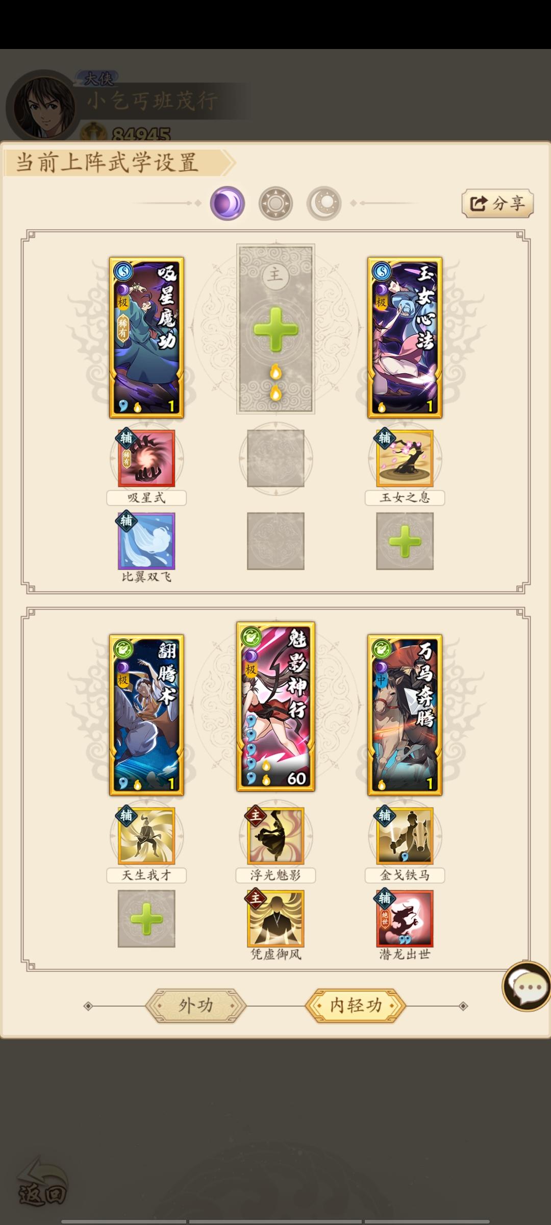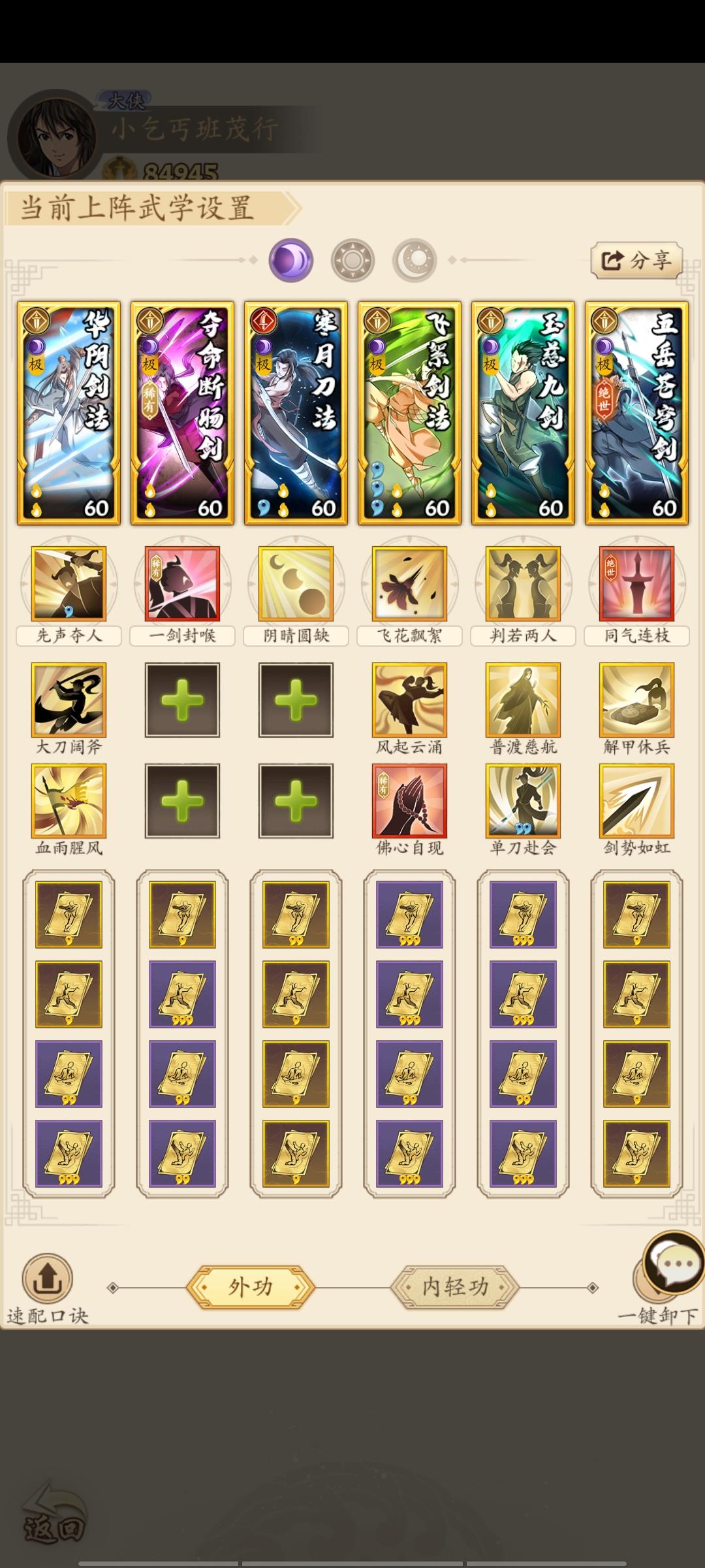 武当前 有气海刀下孤灵剑 幻影剑 寒苍剑可以换位置 主要前面东西少 玩调和剑必要问鼎苍穹 有大彻大悟可以上玉慈九剑下孤灵剑 本人没有无名天下 主要出许愿 一直身法为主 外功先出招式 建议 先觉身法 清风幻影步 七步分身术 选一个 主身法 一直升 先手非常重要 如果武当出潜龙的 可以一直升魅影神行 稀有许愿 悟明剑出招式 气海刀 出招式 武当结束后太极剑出招式 如果 武当前悟明剑 气海刀 都出完了#游戏讨论