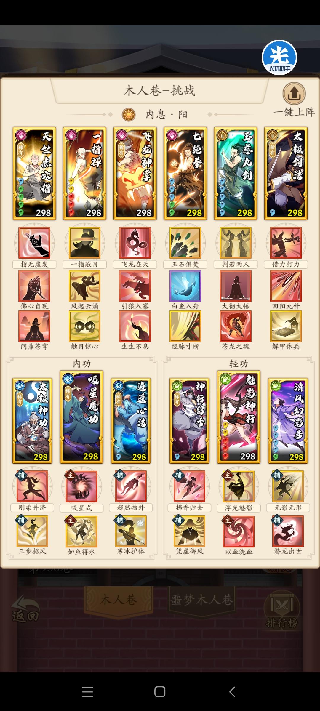 1.三内息通用,用压制的内息打,一般只用调整红色框框的招式,或者偷懒点就全带潜龙。关于调整:调和带腾蛇(回血不多的可以带换骨、潜龙啥的),阴息用吞月(没韦家的那种也可以带一步、潜龙),阳息用潜龙(缺伤害的话可以带唯光明故、无名啥的)有些缺伤害的(主要是主游龙八卦步的跟一些回复招式很多的),可以手动调整蓝色框框部分,白鱼换白鹤亮翅、解甲换豁然通透(不缺蓝也可以用心诚则灵)2.吸内爬塔一般三倍战