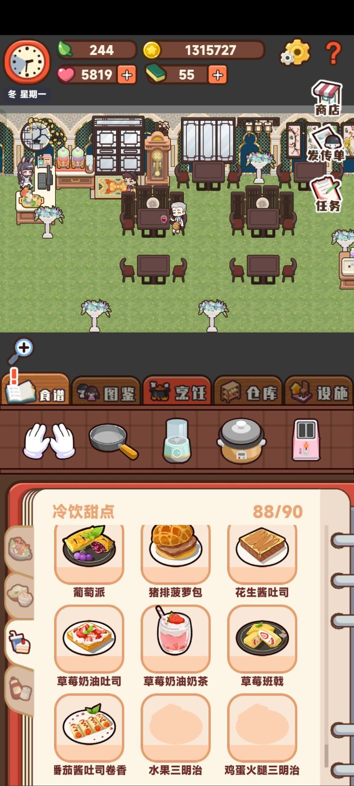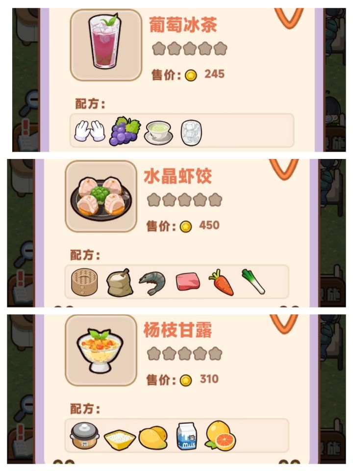 我汇集了一下论坛里大家发的和我自己的食谱,做了表格,如果觉得有用的话,点个赞吧(✧_✧)更新11道菜花生酱吐司卷香肠,番茄酱吐司卷香肠,杨枝甘露,葡萄冰茶,蜂蜜黄油小蛋糕,草莓奶油奶茶,水晶虾饺,土豆浓汤,黑椒鸡排饭,粉蒸排骨,黄油曲奇。PS:因为更新了版本,所以可能有部分食谱跟以前不一样,如果发现食谱不对的话请在评论区留言!#攻略