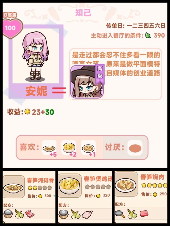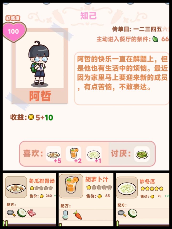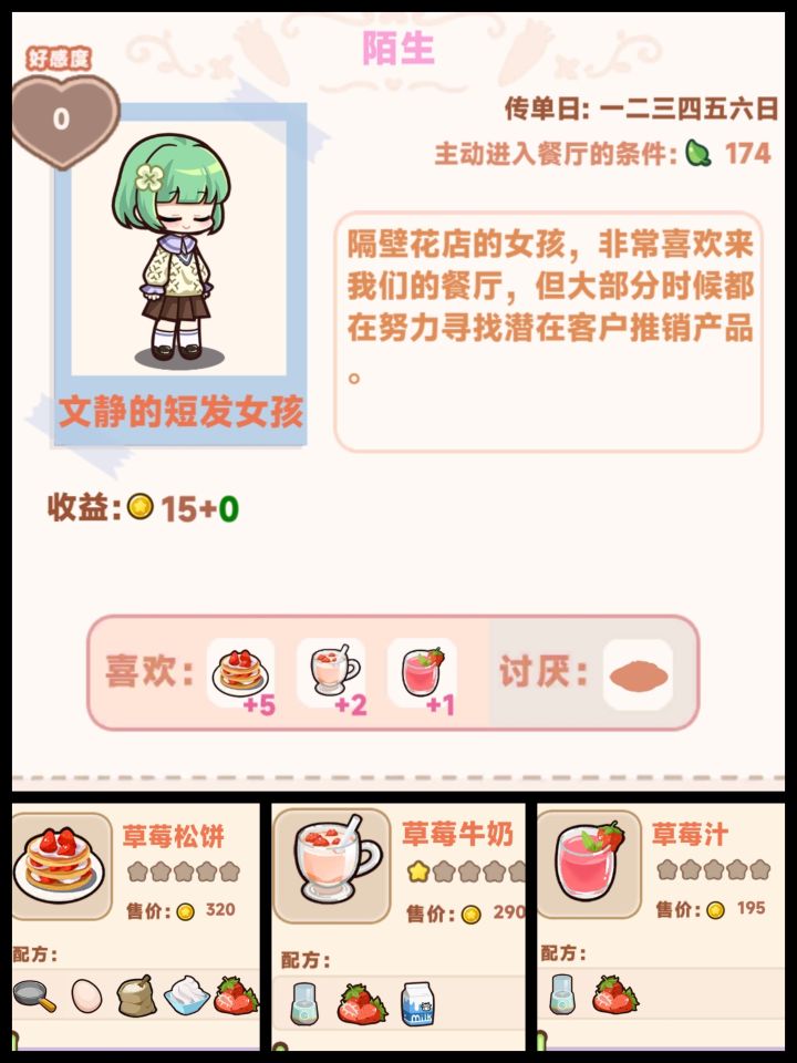 一、1.顾客(可以通过去招揽客人来解锁)(o^^o)♪2.员工是神秘的兔子🐰小姐啦(٭°̧̧̧ω°̧̧̧٭)3.其它人员可以随着开店有概率出现,玩对应的小游戏解锁(*゚∀゚*),不过老鼠🐭会让客人离开,金老板会鼓动客人离开,小偷会偷钱,要记得驱赶(꒪.̸̸̸̸̸̸̸̸̸̸̸̸̸̸̸̸̸̸̸̸̸̸̸̸̨̨̨̨̨̨̨̨̨̨̨̨.̸̸̨̨꒪((- 流星拳二、菜谱(刚刚开始玩各位小伙伴对菜谱都是夜
