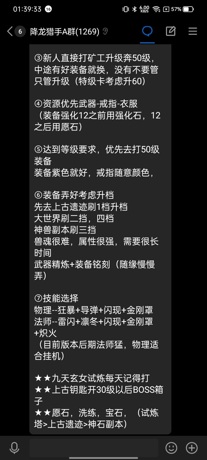 ①进群先领礼包 ②右边打哥布林一套真伤 位置(114-32) ③直接撸矿工升级到30 位置(161-69) ④30直接去史莱姆营地(打二天左右) 位置(6-25) ⑤三天之后去哥布林营地(打二天) 位置(115-60) 然后去试炼塔 位置(25-80) 250-200进城九天玄女试炼 后面三个boos超级难打 ⑥武器戒指强化12, 其它装备强化10, 宝石6-7级 就去打塔,位置(25