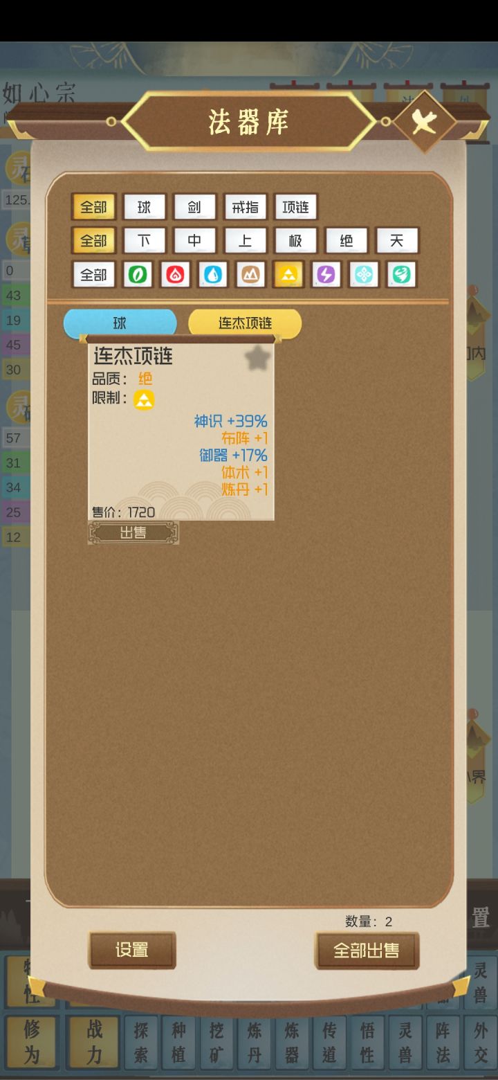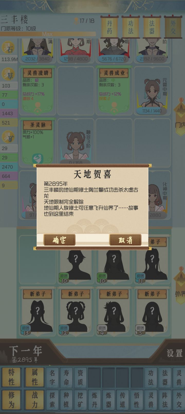 不知道怎么才算通关,玩到地仙23层,2500多年 然后才发现这个游戏有很大的问题。 先说游戏的优点,玩法新颖,ui交互做的也不错,可以看出来,游戏模式是走出了一条新路,挺容易上手的 再说缺点 1.全过程没声音 2.数值系统混乱,随机性太过于强,功法分了等级,属性,武器分了属性,但是来源只能基本靠刷云游商,炼丹,炼器收获过低。炼一堆可能都没能用的。人物基础属性修炼的三围基本对修炼中后期没有加成,后期