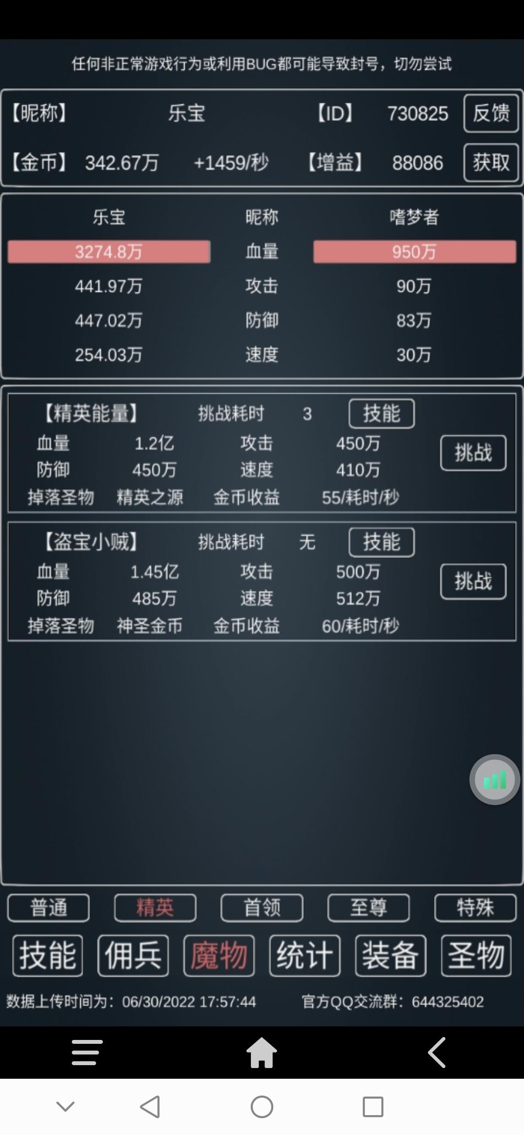 独狼流攻略0.23版本【魔物守护篇】 过关建议:防御最好接近318w,攻击力330w以上。圣物关闭僵牙(无圣火)。 起床第一件事,赌魔物。P1过图时属性,也许并不极限。 基础 6776 007 物理 强攻7 坦克 炼体6 持盾6(防御过高可以不点持盾) 辅助、召唤、佣兵不点 装备 17 10 12 10 圣物关闭僵牙(减少容错) 昨天不小心手贱挂了1w暗夜弩,挂满圣火又要延长3个小时了。😭😭