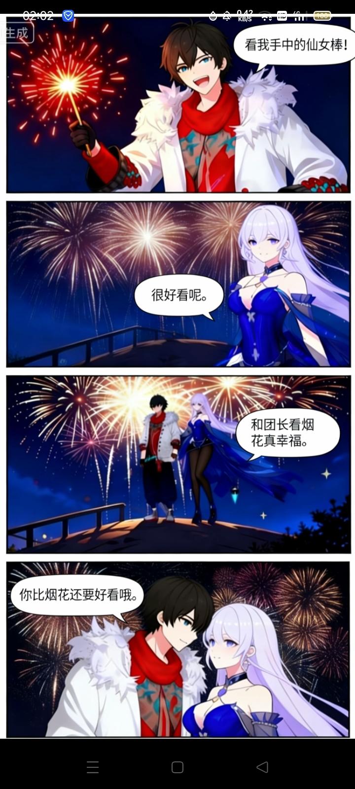 图一剧情:团长和伊丽丝赏烟花。 团长:看我手中的仙女棒! 伊丽丝:很好看呢。 伊丽丝:和团长看烟花真幸福。 团长:你比烟花还要好看哦。 图二剧情:被赤霄撩。 团长:赤霄,为啥像你这样颜值和身材并存的美人会加入我们这种小冒险团啊? (进入漫画剧情对话) (赤霄捂嘴惊讶了一下,随后噗笑了一声) 赤霄:你觉得我漂亮?那是因为你已经爱上我了,笨蛋! (团长脸红) 这里就委屈一下团长大