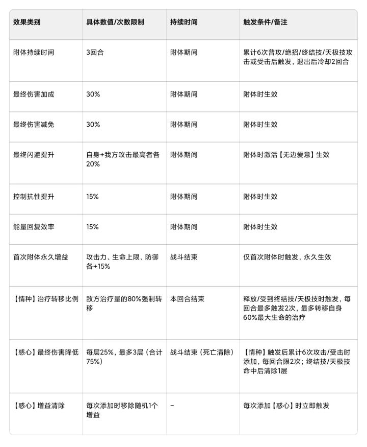 (本文已获得作者授权转载)神灵:维纳斯还是一样,数值在评论区,最下面有简单说。维纳斯是攻防一体+极致干扰型神灵。一、核心机制1. 循环机制:3回合附体+2回合冷却,5回合一循环,首次附体永久提升三维属性,越战越强。2. 干扰体系:【情种】克制治疗→【惑心】削弱输出+清增益,形成完整压制链。3. 全能定位:自身增伤减伤、给核心C位加闪避、控场干扰一体,攻防辅兼备。4. UR成长线:UR1开