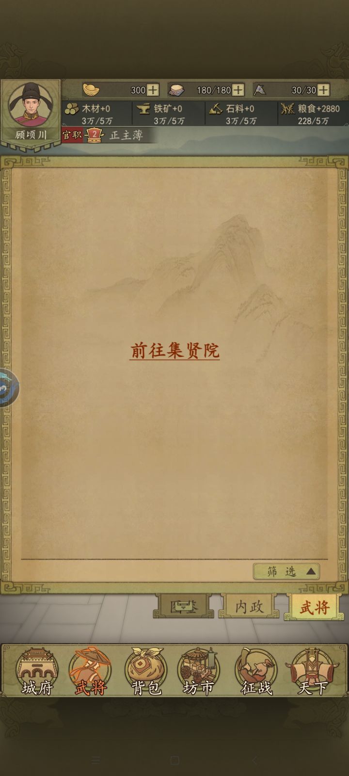 少一个武将打不了,招募要到第二章,卡在第一章过不去
