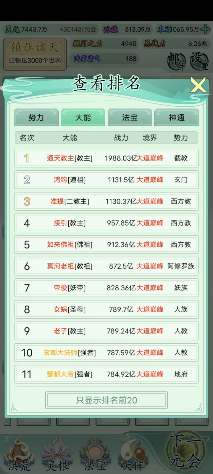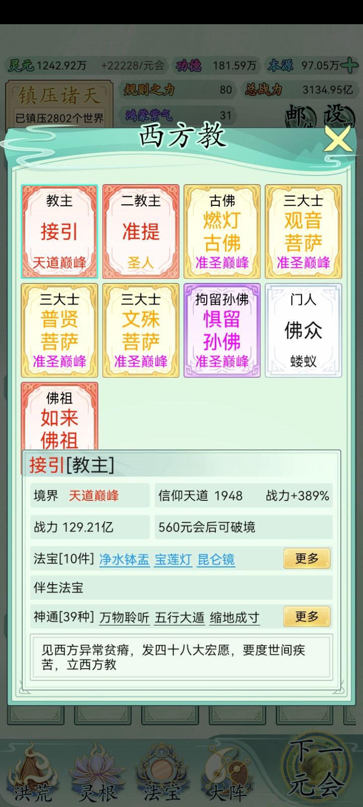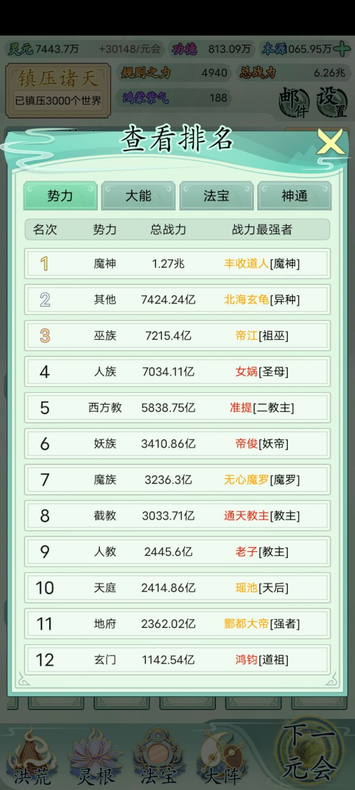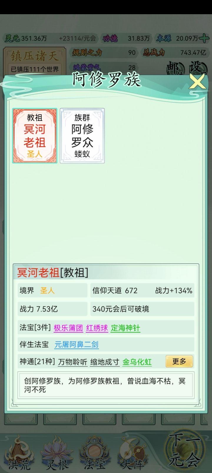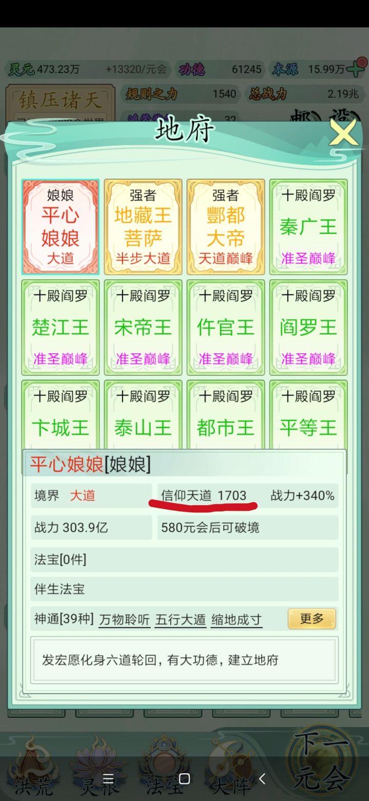 也玩了一小段时间了比不上大佬但还是说一下吧希望大家可以看见前期没灵元可以先把大阵解锁全部调整加灵元灵根尽量升满然后就是各族使命可以用推荐先全部堆灵元足够了看需求再换还有量劫一定要提前化解不然还是会发生还有就是神通和金榜个人觉得这是最主要最容易提升战力的两个方法你看你要养谁就可以给谁先学神通可以无限刷新给谁学不过需要足够的本元还有打入侵一定要百分百再打我百分之九十八被打掉境界过难受的一匹后期然后就是圣位前期能升成圣的一定要升不然战力加太慢了女娲伏羲在龙汗浩劫到准圣就可以在下一浩劫转阵容会转两次到人族之后就可以正常正道成圣了天帝和瑶池也要转阵容才能成圣后土也需要转到地狱但具体我不晓得怎么成圣我是把她地府两个橙色的升到圣人巅峰她突然就成圣了的哦对了还有天命之子可以多一倍的修行速度这个也是看你要养谁