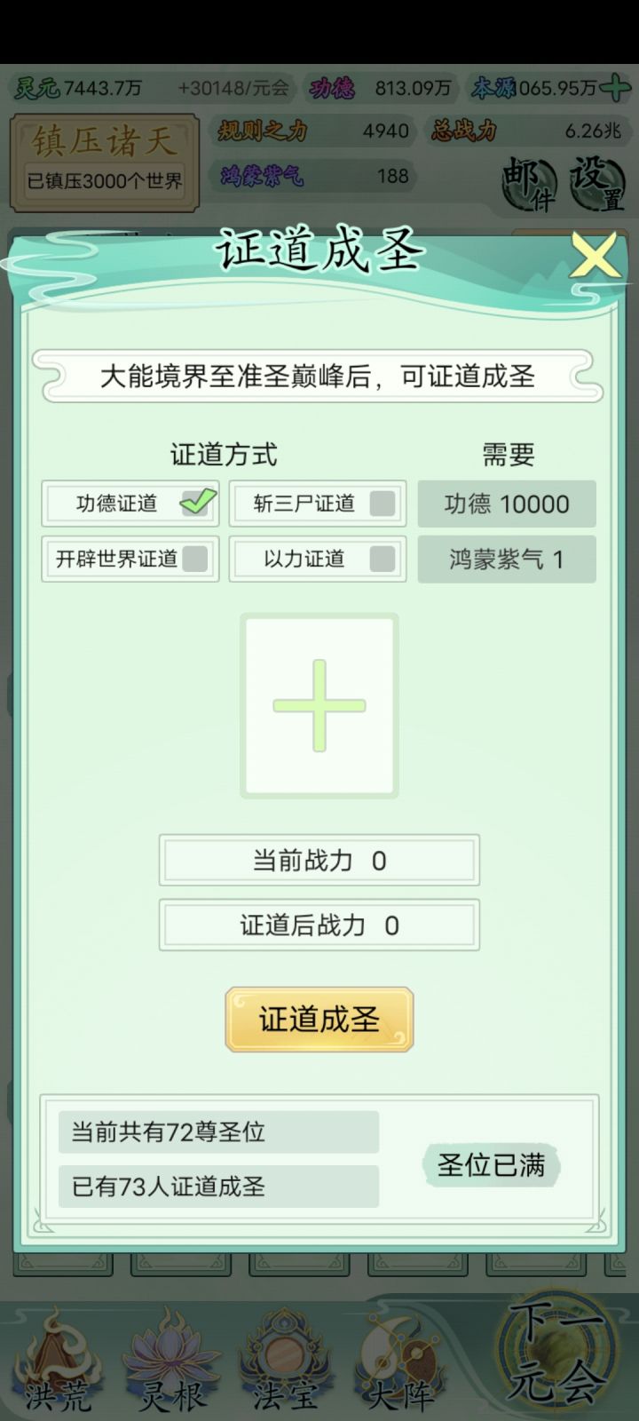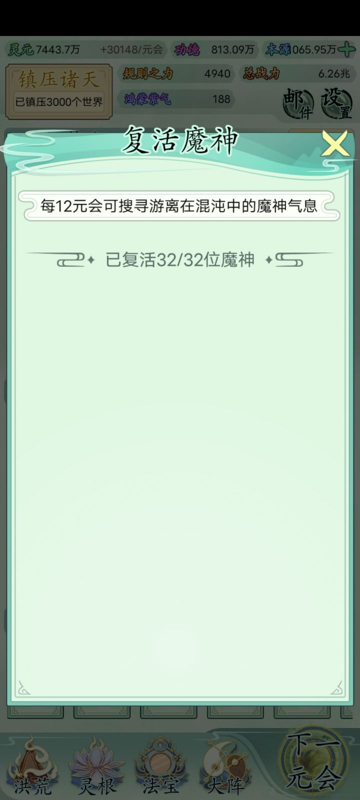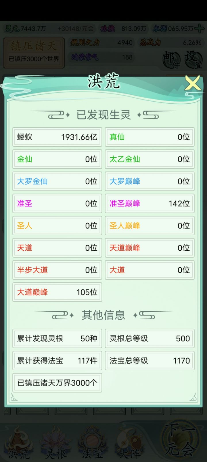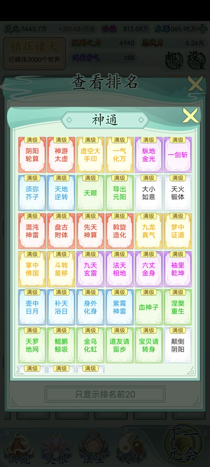 也玩了一小段时间了比不上大佬但还是说一下吧希望大家可以看见前期没灵元可以先把大阵解锁全部调整加灵元灵根尽量升满然后就是各族使命可以用推荐先全部堆灵元足够了看需求再换还有量劫一定要提前化解不然还是会发生还有就是神通和金榜个人觉得这是最主要最容易提升战力的两个方法你看你要养谁就可以给谁先学神通可以无限刷新给谁学不过需要足够的本元还有打入侵一定要百分百再打我百分之九十八被打掉境界过难受的一匹后期然后就是圣位前期能升成圣的一定要升不然战力加太慢了女娲伏羲在龙汗浩劫到准圣就可以在下一浩劫转阵容会转两次到人族之后就可以正常正道成圣了天帝和瑶池也要转阵容才能成圣后土也需要转到地狱但具体我不晓得怎么成圣我是把她地府两个橙色的升到圣人巅峰她突然就成圣了的哦对了还有天命之子可以多一倍的修行速度这个也是看你要养谁