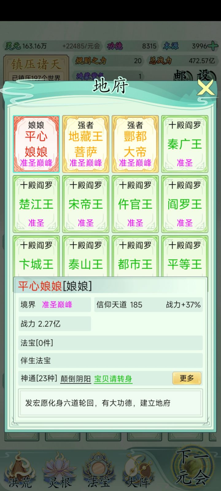 提几个建议。1.建议可以用鸿蒙紫气提升一些不能成圣的人物的跟脚,提升后他们也可以成圣2.圣位现在有些少,建议增加圣位或者红名人物成圣不占用圣位 3.建议白色蝼蚁中新加事件,发掘天才,从这个事件中可以加入新的蓝绿色人物,名字随便取就行,跟脚就是XX族天才。