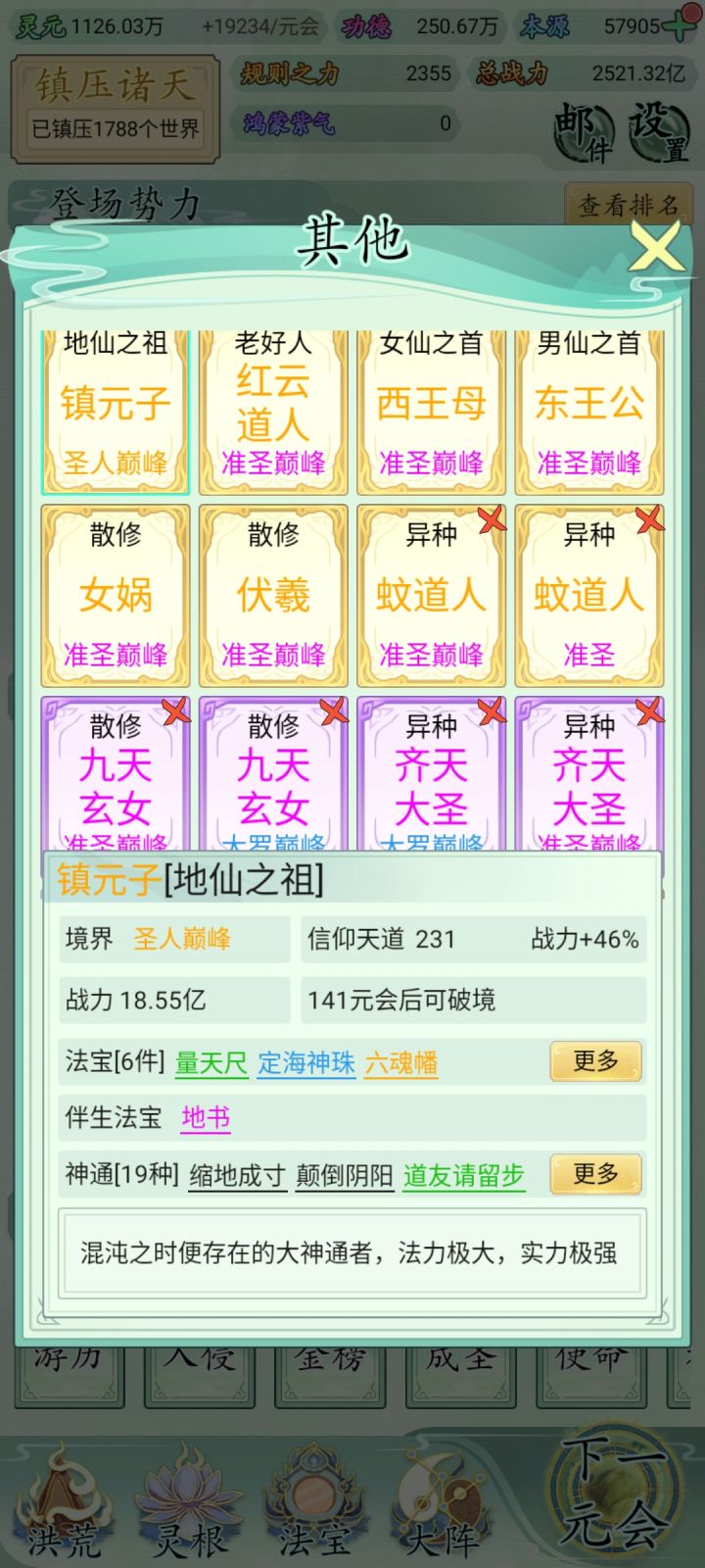 还有九天玄女应该属于天庭的吧!放其他里面干嘛?还有西王母属于西昆仑势力,东王公不是最后化为吕洞滨了吗?那个西游的的七大圣应该都属于妖族,齐天大圣之前属于妖,斗战胜佛后属于佛教,最重要的神逆不是开天凶兽首领吗?不是四凶兽的老大吗?