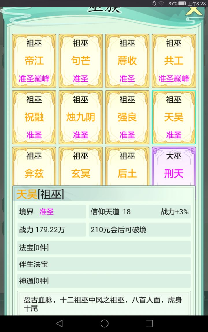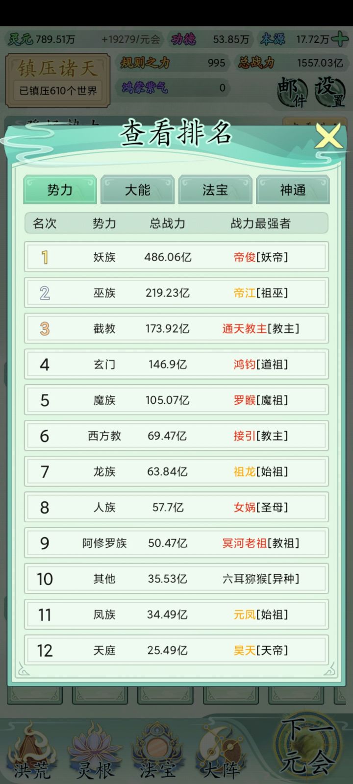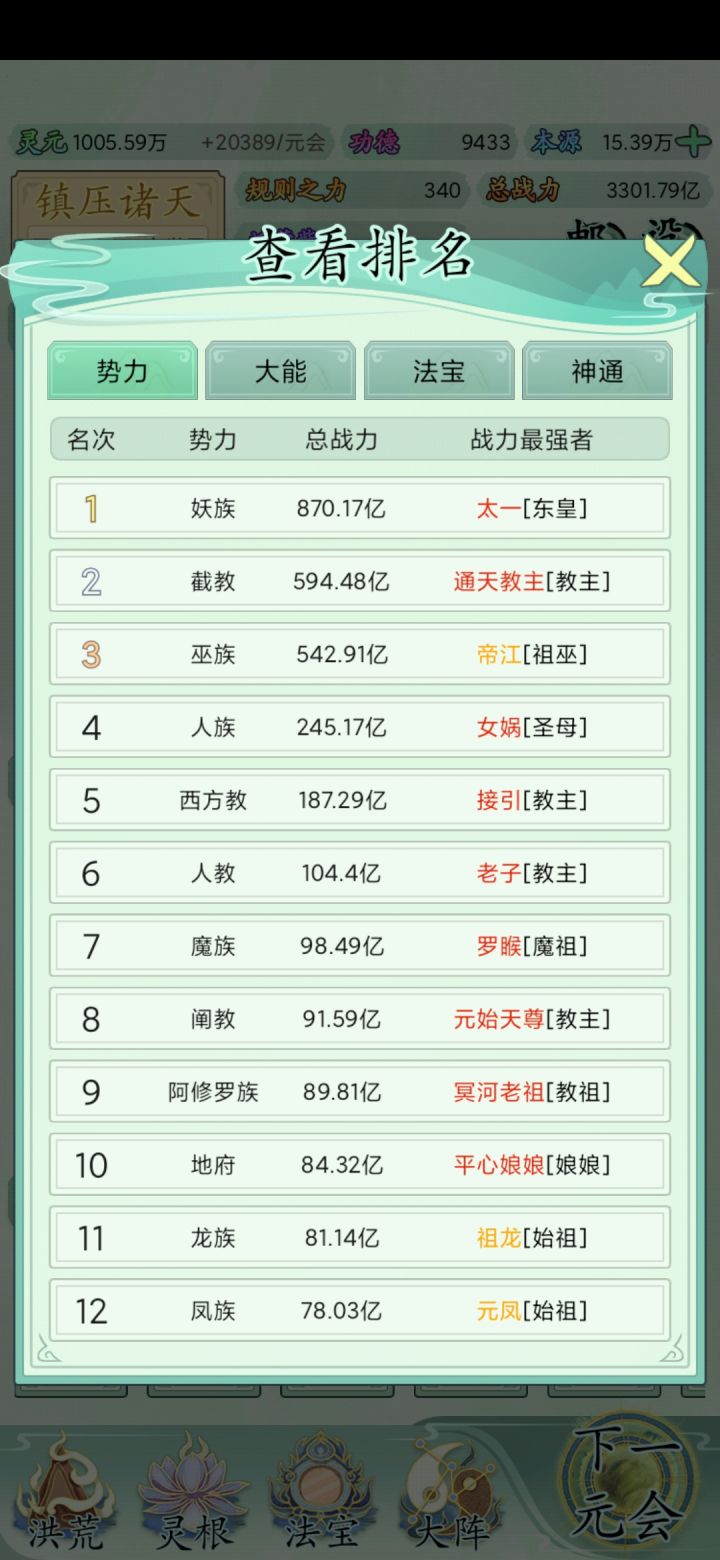 总体感觉,一,妖族还是最强的,双帝太bug,还有阵法加成仅次于截教,截,巫次之,主要培养这三教就可以了,战力提升更快。二,紫气太缺,希望可以提高紫气的获取,通关了圣位都没满,而且后期成圣已经没什么大用了;三,可以加强人物这方面,比如技能啊,新人物啊,特性之类,不然也就是人名不同而已。游戏总体不错,不过三劫之后就是点点点,可以改善一下。