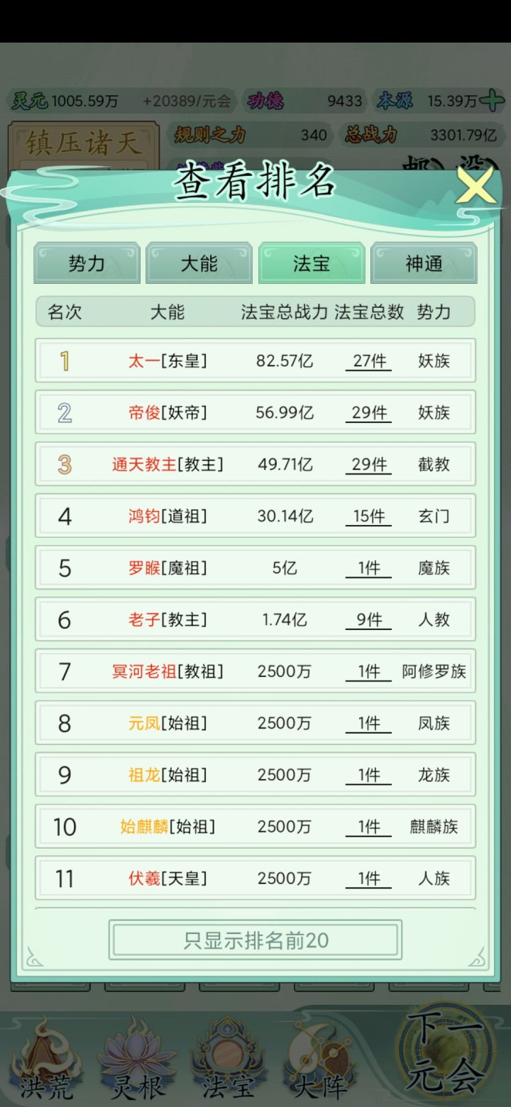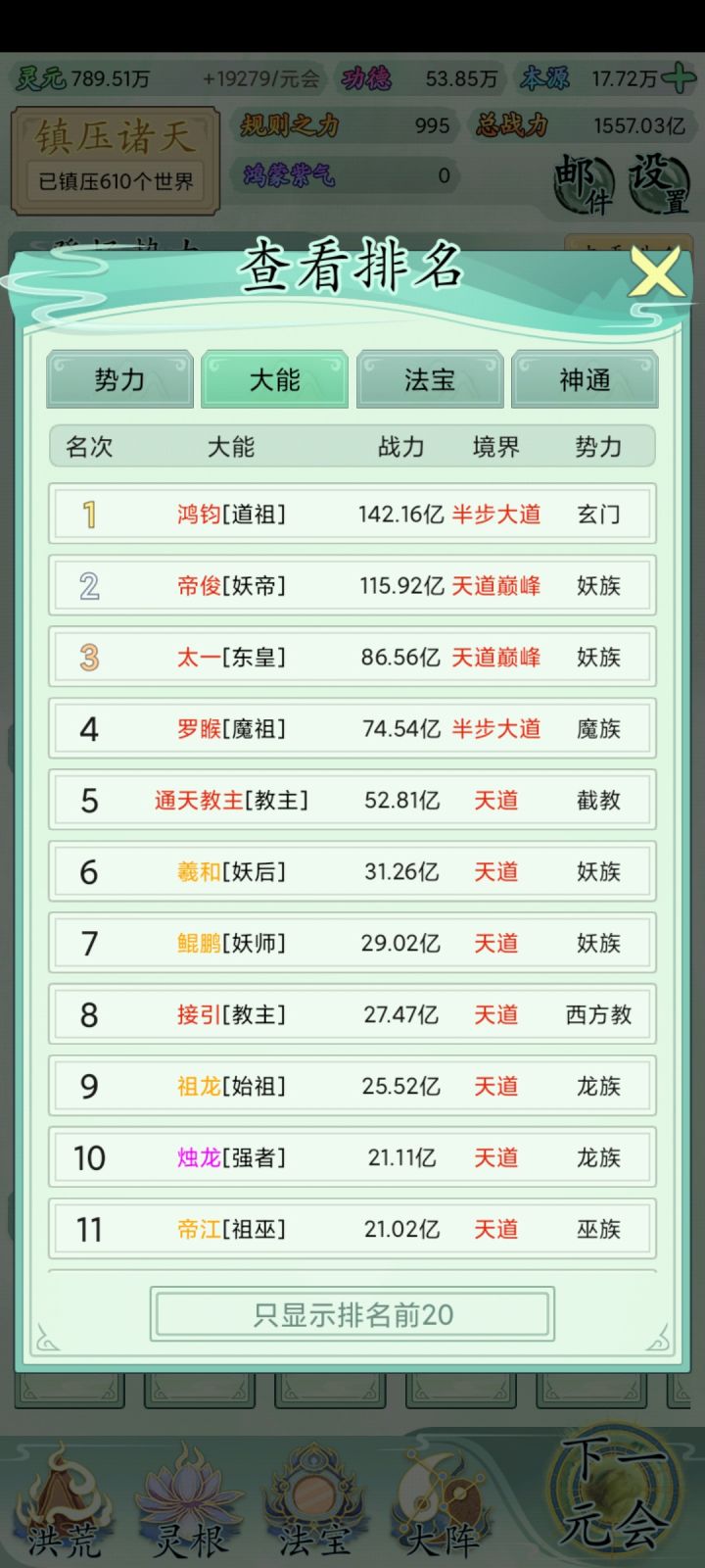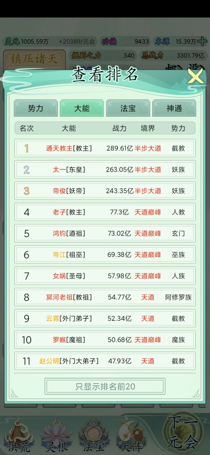 总体感觉,一,妖族还是最强的,双帝太bug,还有阵法加成仅次于截教,截,巫次之,主要培养这三教就可以了,战力提升更快。二,紫气太缺,希望可以提高紫气的获取,通关了圣位都没满,而且后期成圣已经没什么大用了;三,可以加强人物这方面,比如技能啊,新人物啊,特性之类,不然也就是人名不同而已。游戏总体不错,不过三劫之后就是点点点,可以改善一下。