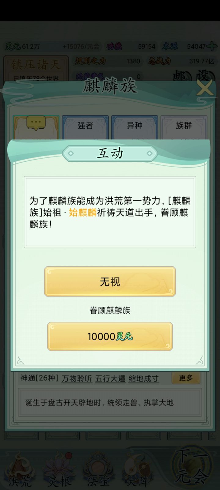 麒麟族祈祷天道出手,点击无视后卡在这了了,只能退出游戏重进