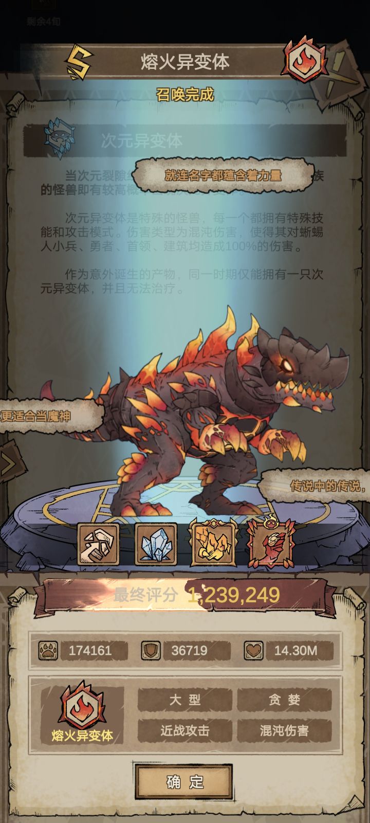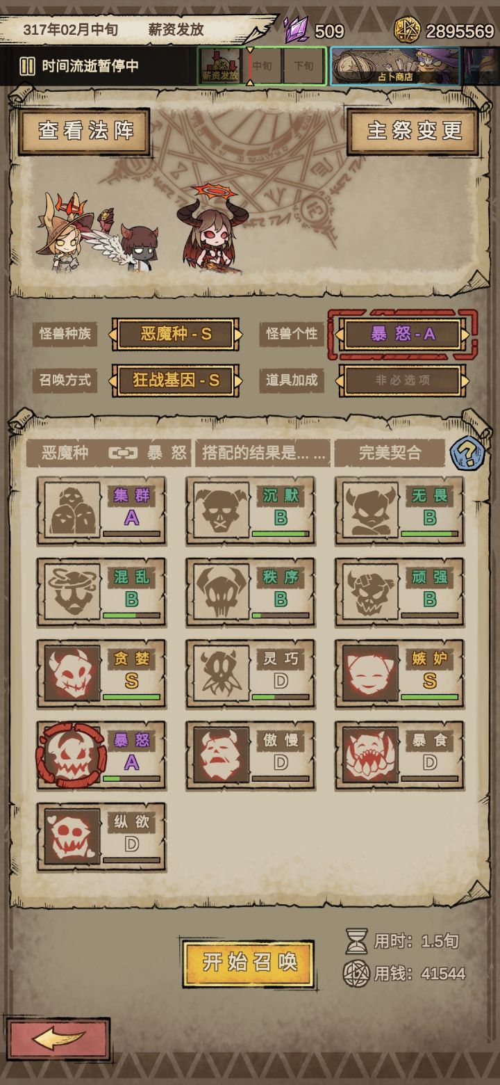 基础召唤、喂养提升、申请极限?一、基础召唤怪兽属性召唤时依托于魔使,我在魔使属性(主祭100%,配祭40%) 提供总和在19.7万左右时可以召唤出900万左右战力的怪兽魔使属性提供总和极限是27~29万,怪兽战力大约是1200万左右,加上药水临时突破或看广告,普通怪兽极限1400~1800万左右图片太大,这两个800战力左右的怪兽你可不要小瞧,这两个是我第一个废墟30关的2.4号位,(懒惰