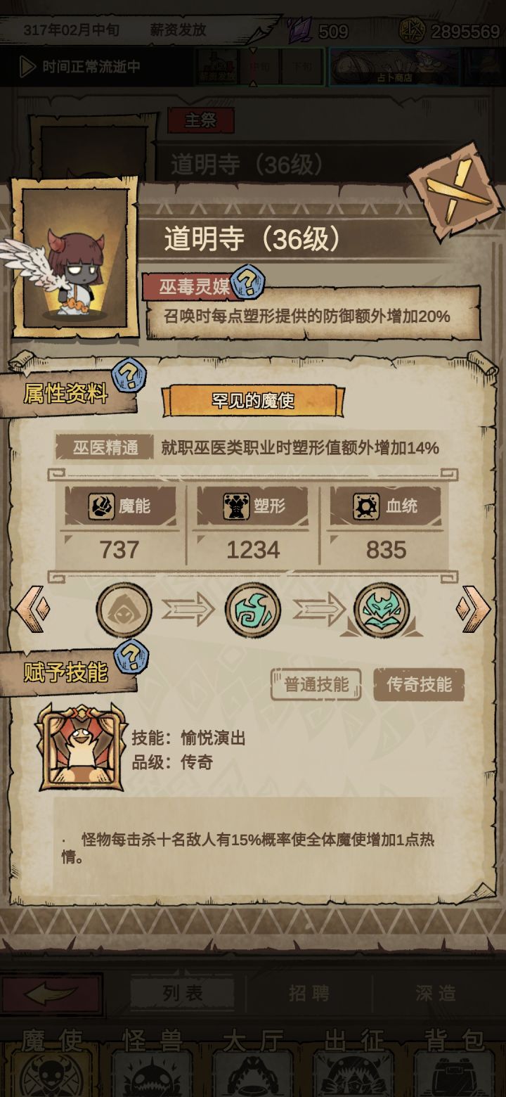 使魔选择:招聘升级额外加魔能血统塑形30级以后用洗魂香刷新选人才或天才转职必须要有三个术士,都是主祭,一个变贪婪魔王传奇技能术士选汲魂龙爪,其他职业技能随便选,后期随便选一个使魔带愉悦演出回热情主祭选择:主祭一个贪婪魔王带汲魂龙爪(如何带技能下面有说),另外两个术士也带汲魂龙爪魔王选择:转贪婪魔王用30级术士带汲魂龙爪转,因为魔王传奇技能刷不出专属技能,其他魔王随便可以把所以魔王都弄成龙爪,也可以不用,贪婪魔王必备