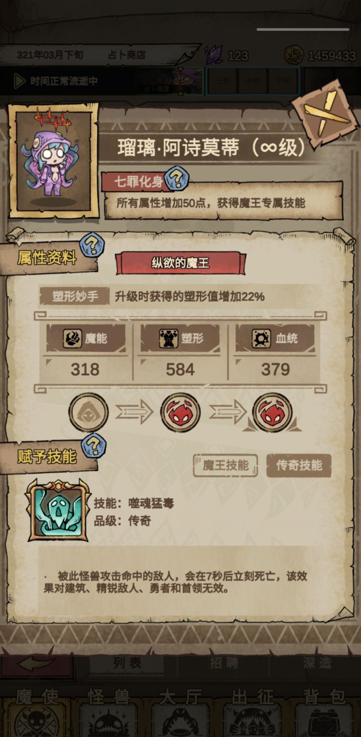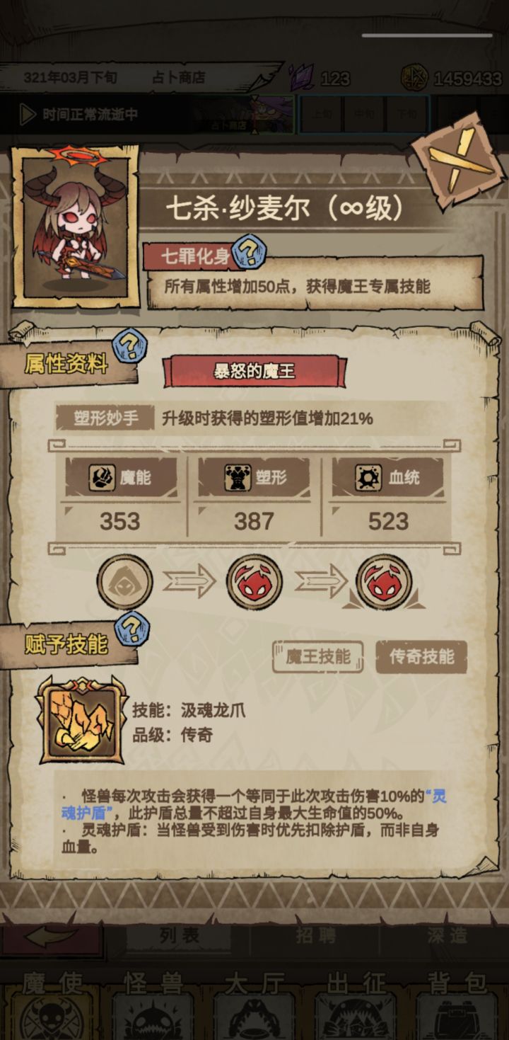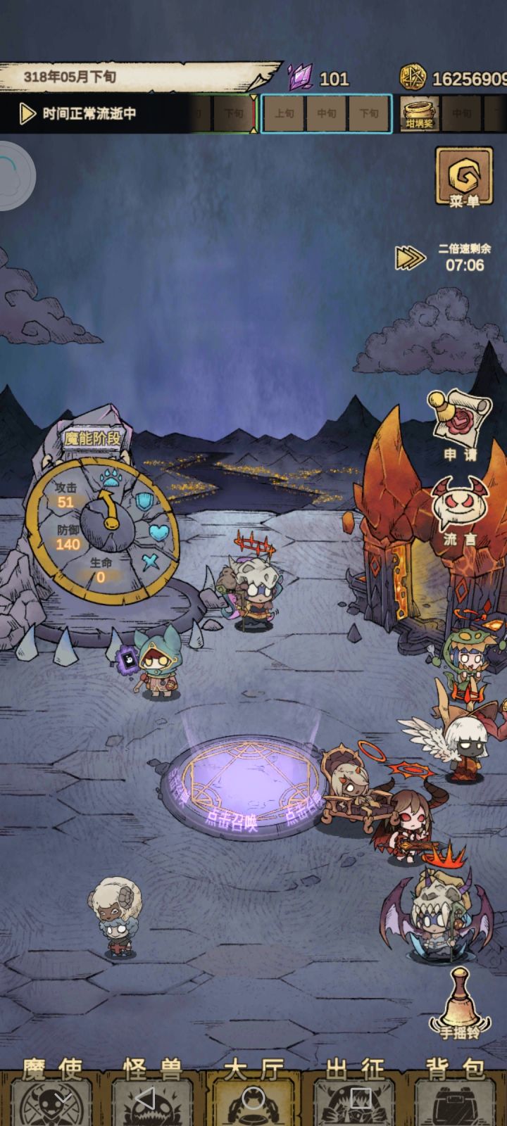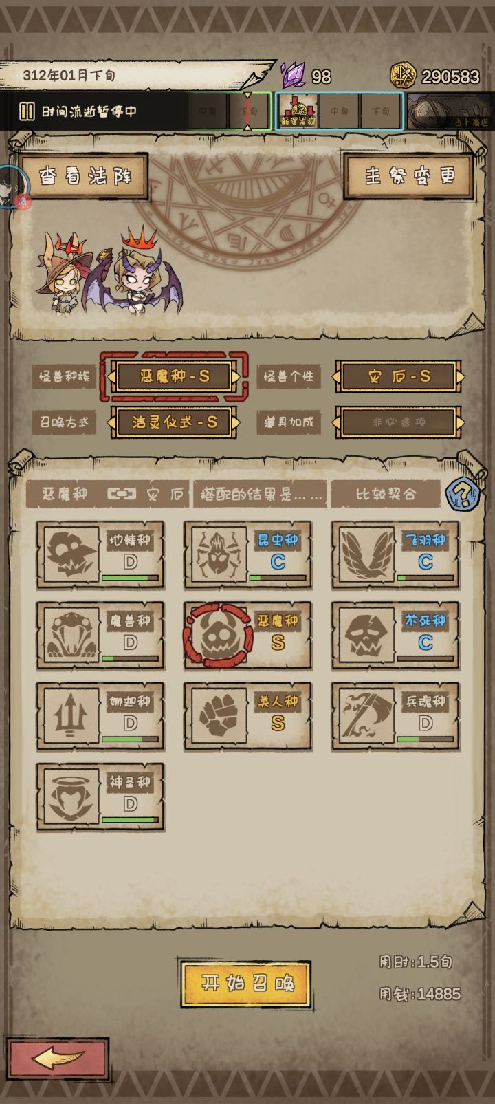 怎么说呢,其实我还没明白怎么玩就通关了,其实一天就可以通关,我大概加起来也没多久就通关了,我还稀里糊涂的,连s级法阵都没有,我个人觉得恶魔种挺强的,不过前期要是把类人种刷出来了可以先培养类人种到s级,因为后期有个任务要类人种达到s级,我前期刷出来了恶魔种搭配灾厄刷到s级,后期才领到类人种的任务,召唤其实挺推荐洁灵仪式的,因为刷到s级之后,几乎不管种类有没有s级都可以召唤出s级的就是热情度消耗比较快,刷到钥匙一定要买,因为钥匙出现之后可以转化魔使,可以加强召唤的怪兽,其实挺有意思的,这些大概就是我的个人推荐吧