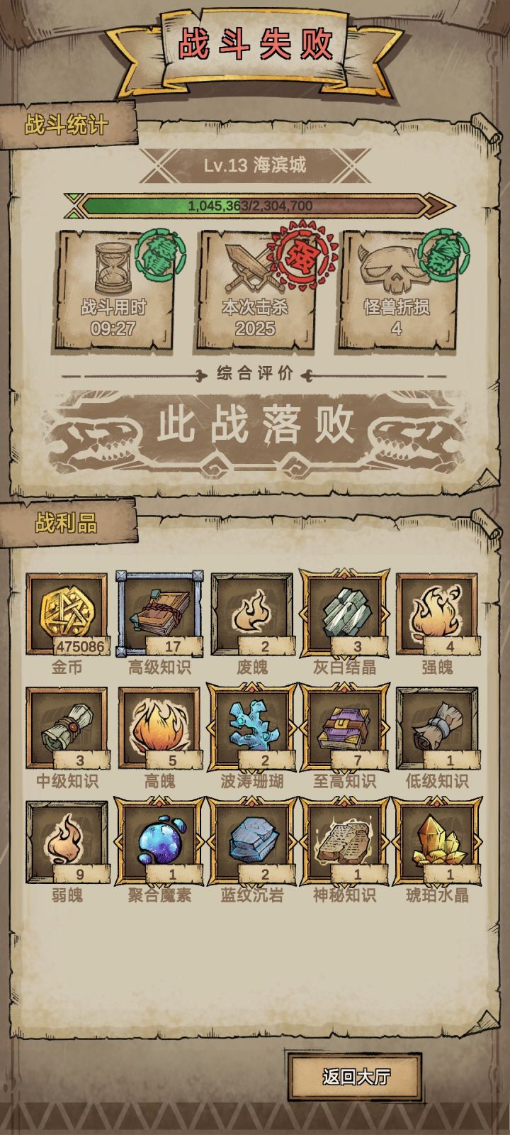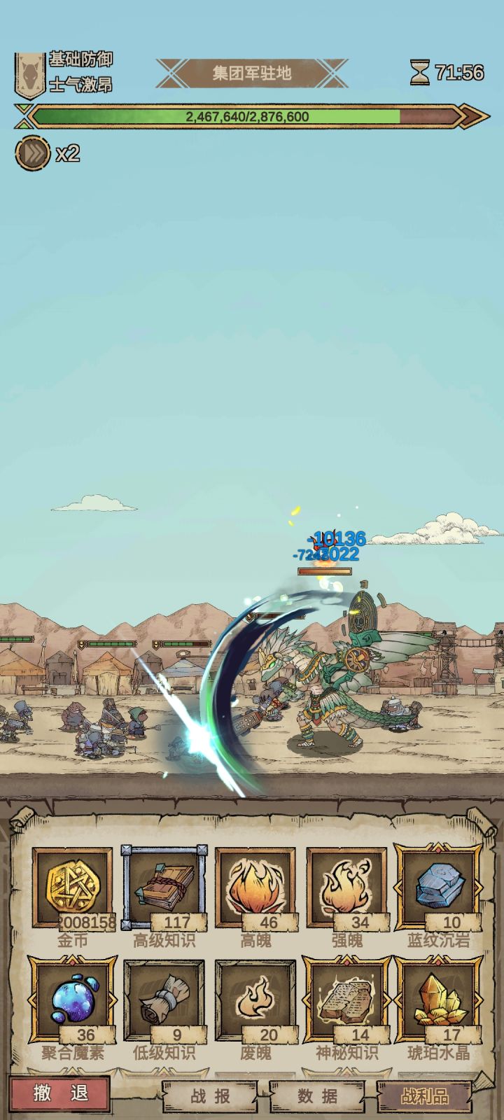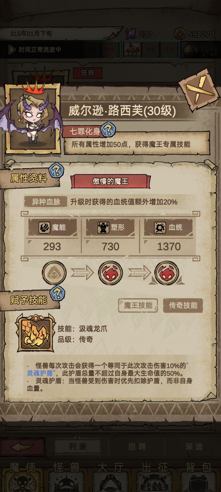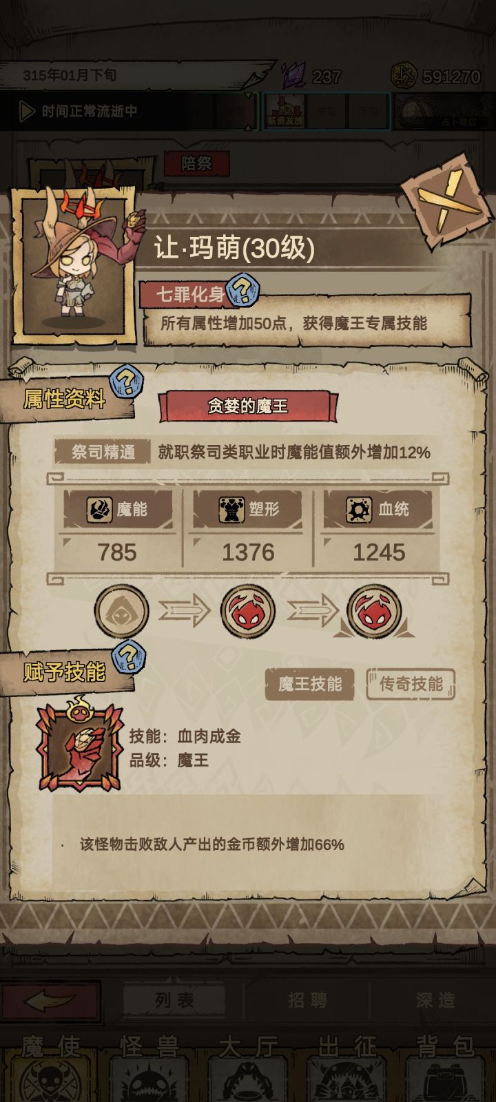 只需一只贪婪魔王(额外金币加成特性)最重要的是一定要放2、4号位其他的位置攻击力和血越低越好防止拆家,2、4号位哪怕拆家的都死了还是一直打怪的,到这一步基本可以无限刷怪了,需要注意一下拆家过半会出现勇者不能撤退只能过关该撤退就撤不要贪钱(确实没注意勇者出来了删后台重启就行),因为我带的是额外金币和回复情绪的技能导致后面扛不住死了,我发现一个技能和额外金币绝配(如图下)理论无限刷,把汲血龙爪和血肉成金一放一把几百万金币不是问题,基本都是一下一个怪盾肯定不会破就看能活多久了,希望对你有所帮助吧