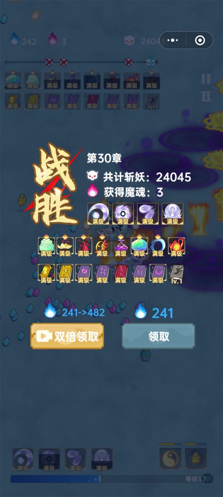 希望大家注意一下我的走位,你没看错,我的屏幕失灵了,这关打了好几次,每次都是倒在boss出场之后,所以我选择焚魔刃+火灵珠+风灵珠瞬秒,不然有复活也没用的,我那点血三秒就没了。也希望官方优化一下,怪的数量太多可能游戏运行不过来啊