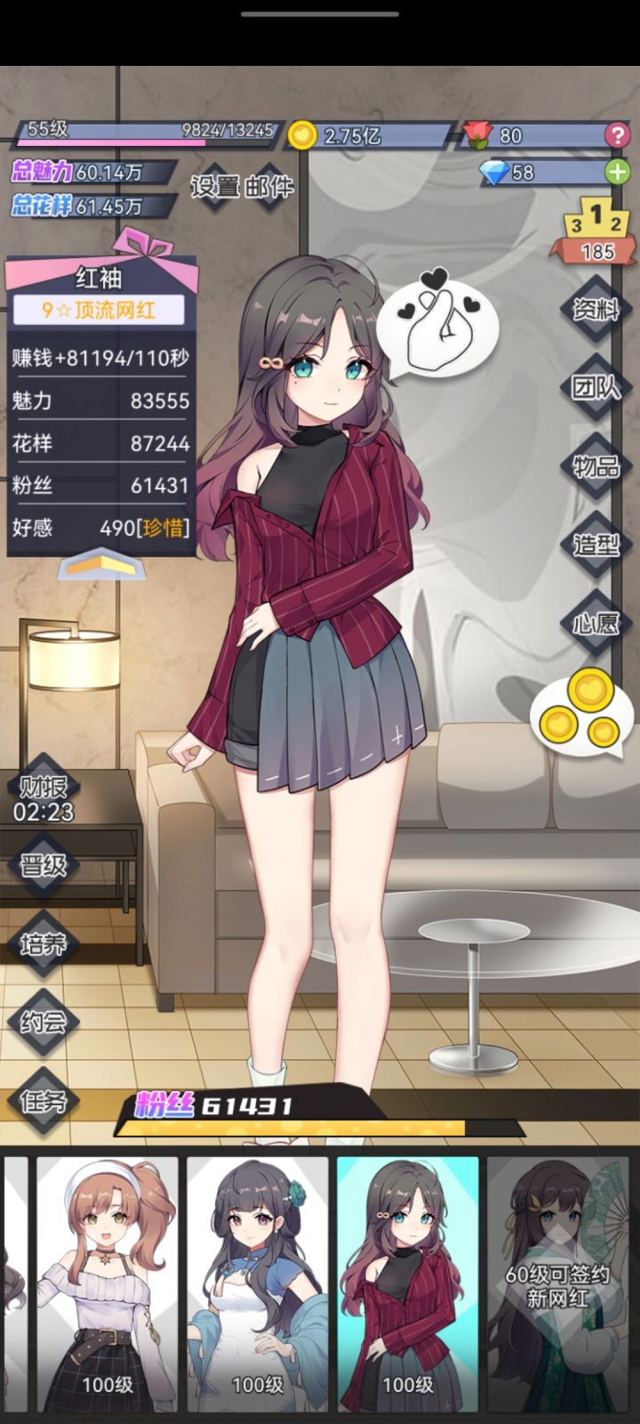 希望有个商店,衣服要好看,价格都好说,货币混合好多金币+好多花什么的,造型等级满足购买的什么,好感度等级限制什么的,哪一个女友专属衣服什么,那些满级玩家金币都快万亿了,希望会更好!也可以添加一些小游戏可以更多与女友互动方式。