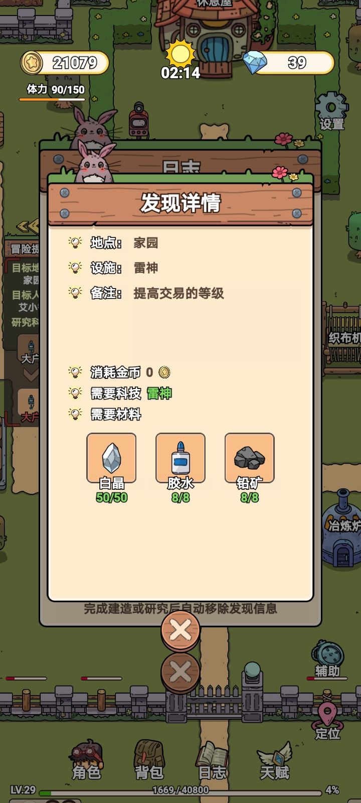 一、升级大前期升级还算比较容易,挂挂机,或者到晚上刷夜魔升级都很快。前期升级建议把栅栏升满,然后晚上挂机刷木头。大概2天能升3级,算是前期比较好的升级方式(还能同时刷木头和白晶)。需要偶尔留意一下栅栏的情况,快坏了补3个木头修一修,然后接着挂机刷树。二、天赋每升一级可以获得1点天赋。前期建议先把探险家的交易和工程师的农业点了(赚钱需要),其次把工程师里增产、和探险家的健身,巧力点了,一