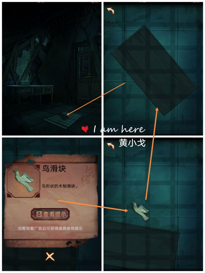 第五章:游梦劫1.(房间1)点击地上的木板,在木板下面获得【鸟滑块】2.点击查看门窗上的图案,可拼成一个正方形,注意看鸟、树叶和花在窗格上的位置3.点击桌子上的盒子,放入【鸟滑块】4.根据鸟、树叶和花在窗格上的位置,调整滑块的位置5.打开盒子,获得【手电筒】6.查看桌子上的书7.点击门旁边的墙,打开【手电筒】,获得线索:龙马猴狗8.点击门上的锁,结合墙上的四个生肖和书上生肖对应的天