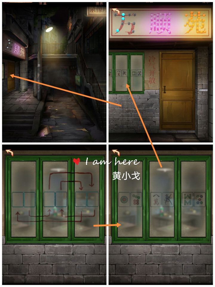 第六章:惊魂渡1.(巷子)点击麻将馆的窗户,翻转玻璃窗,查看玻璃窗两面的麻将及其连线走向,得出规律(七筒指向八万,八万指向五筒,五筒指向幺鸡,幺鸡指向八条,八条指向一筒,所以顺序就是七筒八万五筒幺鸡八条一筒)2.点击麻将馆门口的机关,把麻将调整为:七筒八万五筒幺鸡八条一筒,打开门3.(麻将馆)进麻将馆,触发剧情,获得【笔记】和【钥匙】4.在柜子上获得【水壶】5.点击左边的麻将桌,获得线索