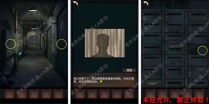攻略作者:迷失攻略组-路人A未经许可,禁止转载,侵权必究!图文攻略第二章18.和保安对话,然后打开信箱,拿到【卡片】。18.119.对安全通道标识牌使用【卡片】,左右移动卡片,得到密码【寅申酉卯】。19.120.输入密码【寅申酉卯】,打开信箱的密码锁,拿到【钥匙】。20.121.用【钥匙】打开楼道门,上楼前往701房。21.122.进入佳颖房间,取出闹钟的【电池】。22.123.