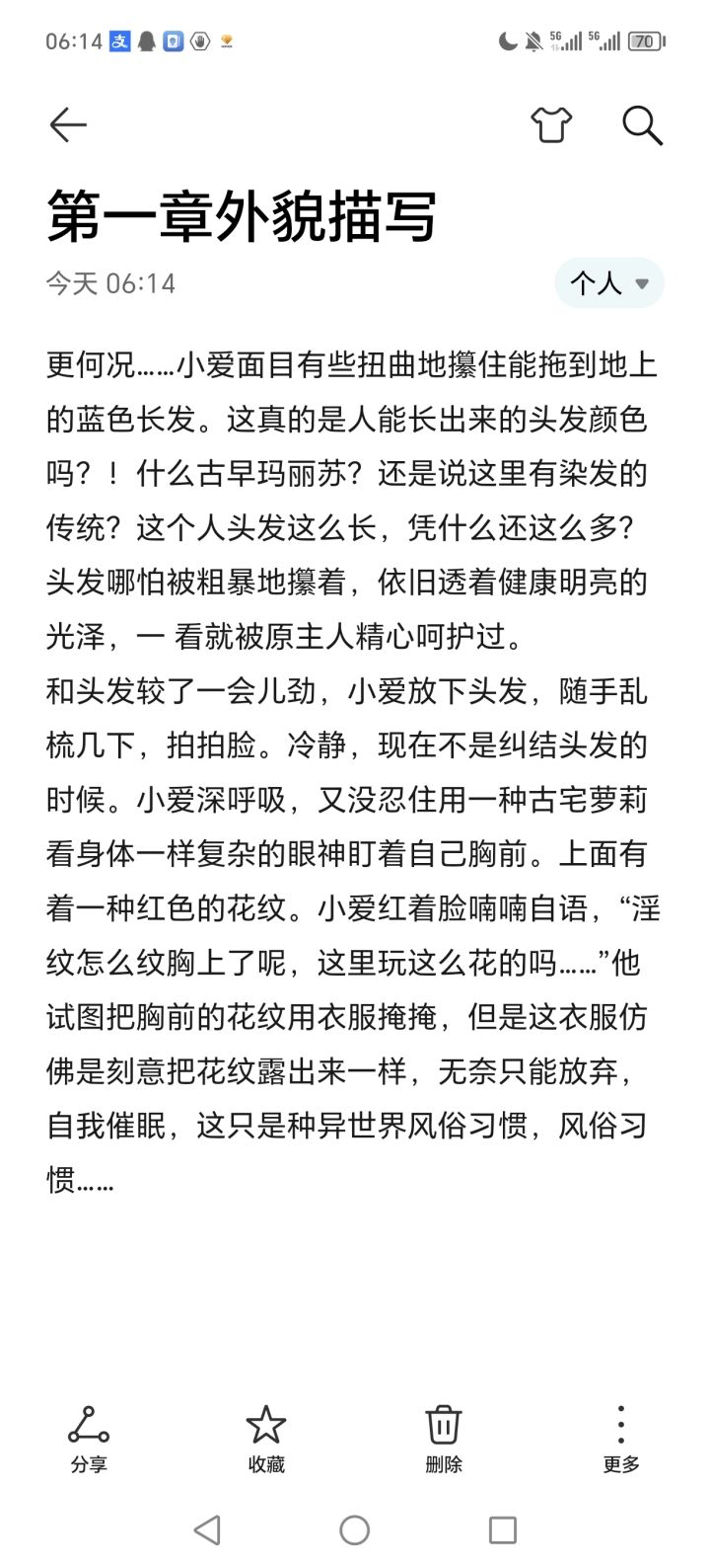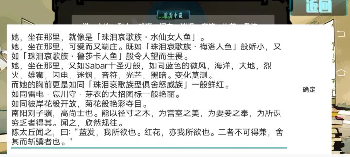 【小爱顾镜自怜,这副皮囊生的是极美的。墨蓝色的长发如瀑,质地如同流动的汪洋,松松地用一根金丝苏绣发带束着。如玉的指尖轻轻往下,划过湿红的眼角、不点而朱的唇,落在自己的脖颈上。修长白皙的脖颈,像一簇一掐即断的蔷薇花,观者感其脆弱,而真正摸上去,却能感受到底下靛青血管里跃动的蓬勃生命力。只有这时候,小爱才会有一种自己换了身份活在这世上的实感。再往下,微敞的领口下,血色的花纹隐隐绰绰,橙色的阳光斜斜