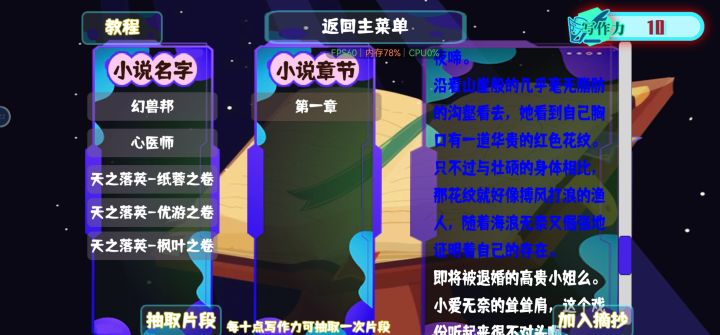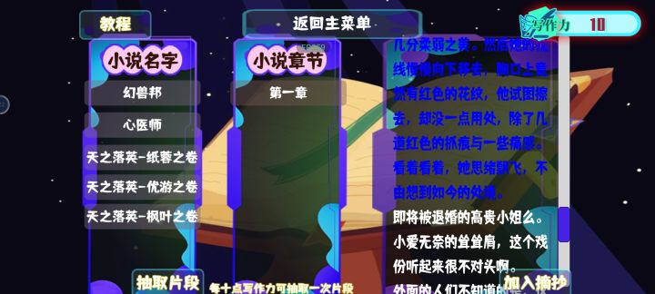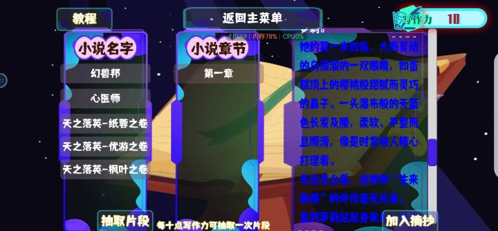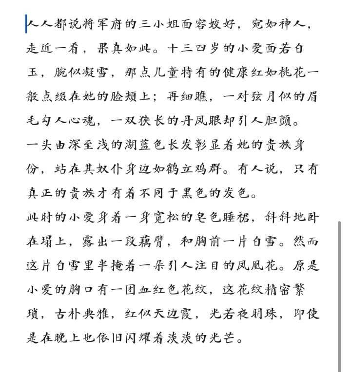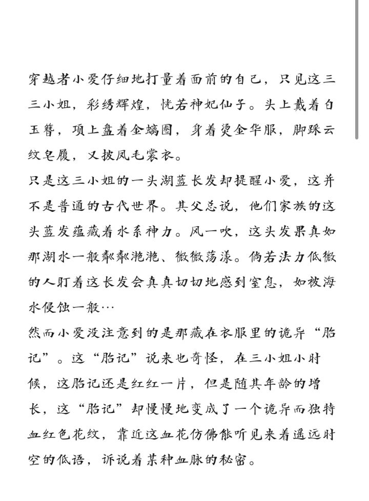 上大学以后就没什么动力拿笔写东西了,天天不是上课就是打游戏。偶然看到这游戏,确实是个重新提笔的机会。之前没怎么接触过网络小说,跟着引导尝试一下新的体裁确实是有趣的体验。在此献丑,还望各位斧正:她盘腿坐在与她同高的雕花木椅上,双手抱胸,愁云惨雾。匹练一般柔顺清透的靛蓝色长发披于脑后,与缀饰其上的珠玉宝簪一同,于纸纱窗滤过的、午后轻暖的阳光下熠熠生辉,仿若剪下的一篷银河。刘海微斜,长鬓及肩,衬托一