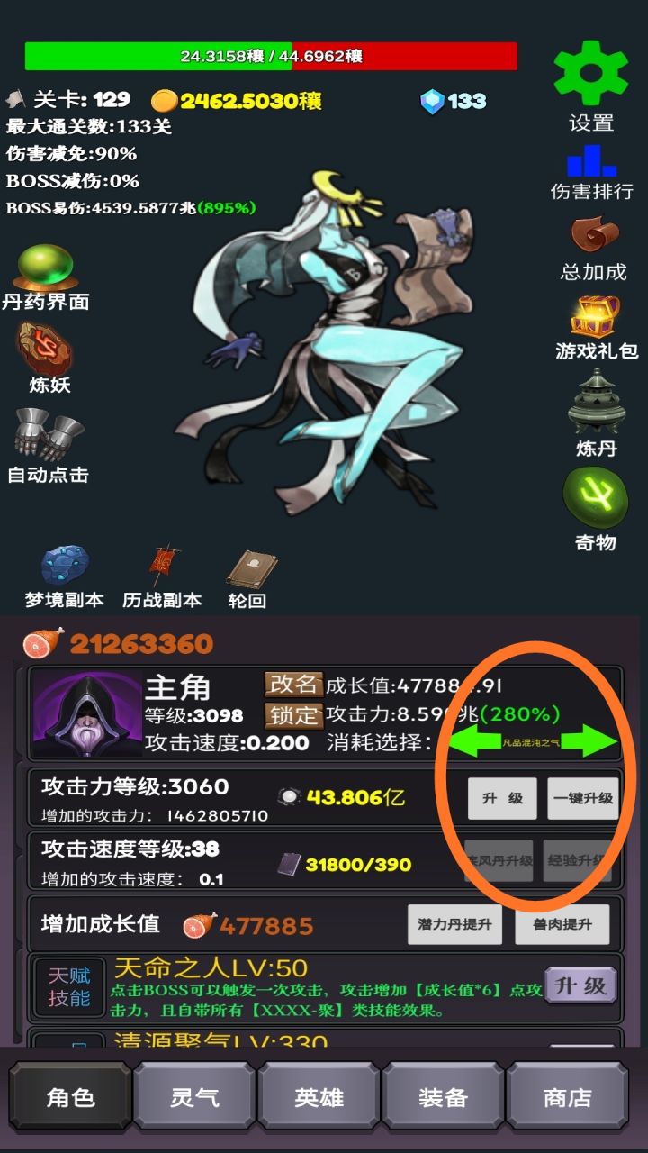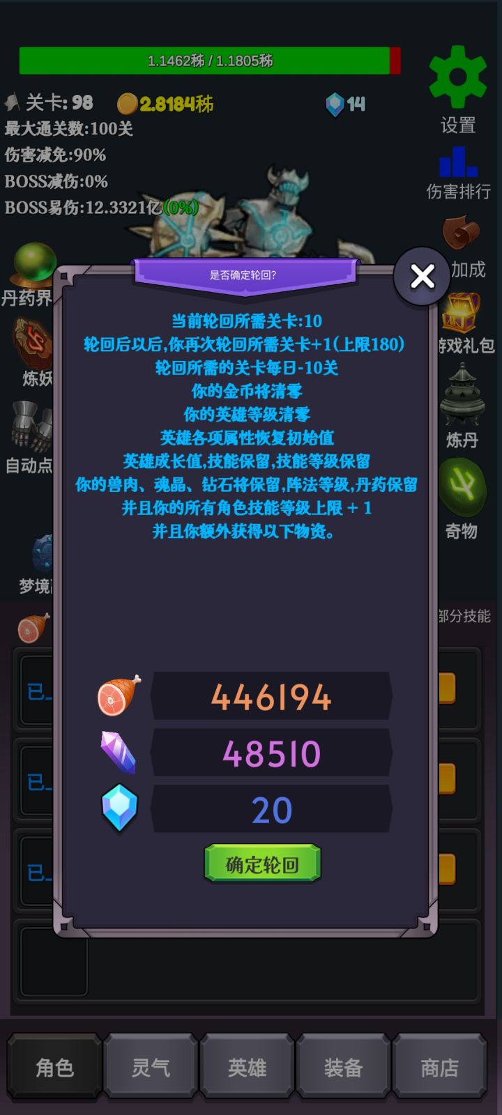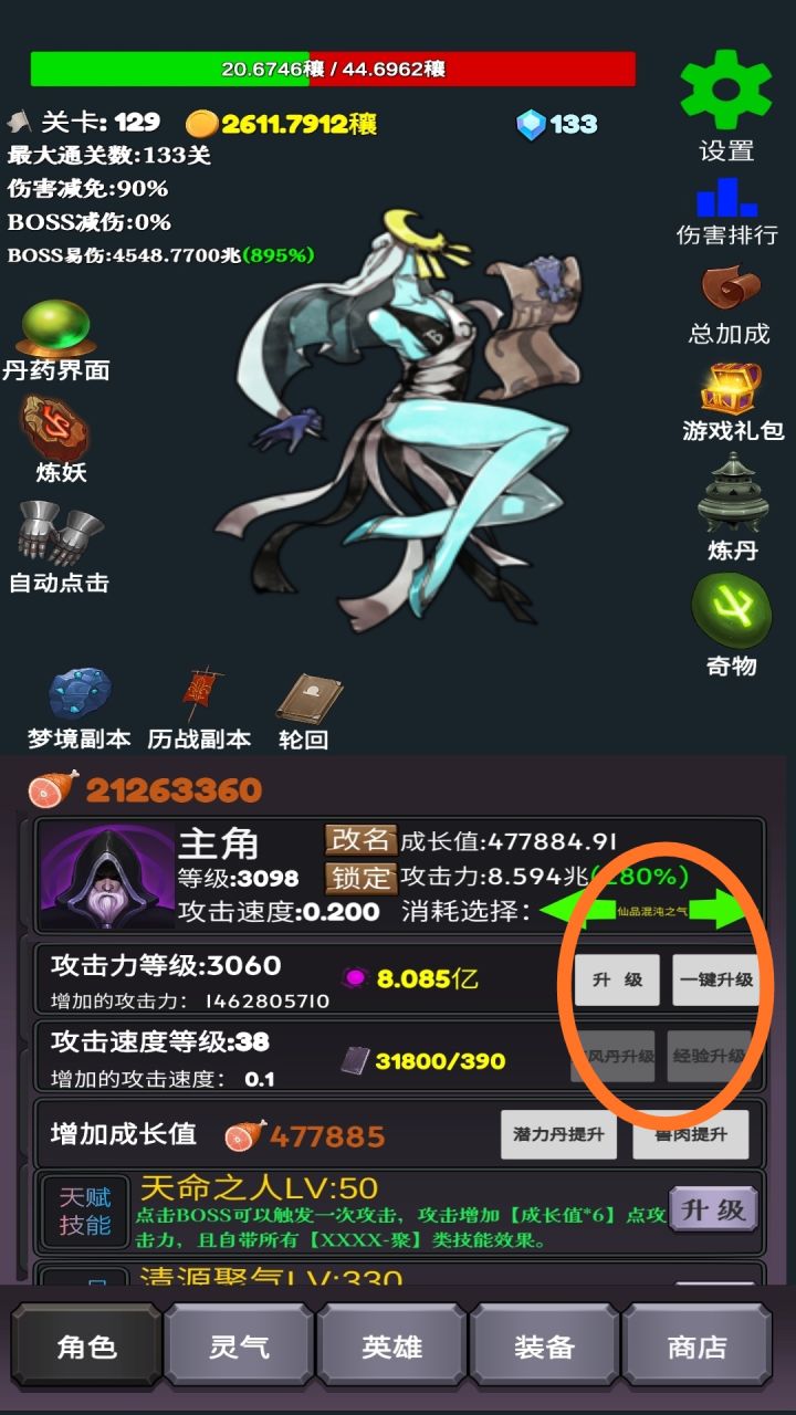 游戏良心,疫情宅家玩了七天停不下来。提个建议,把一键提升加入灵气提升,每次轮回既要金币一键提升,还得各品灵气一键升级,太累太费手点击了。一个英雄轮回后一键升级:金币+灵气=7次20个英雄*7次=140次140次*轮回30次=5200次。每天一键提升要点击5200+次,望作者大大改进。