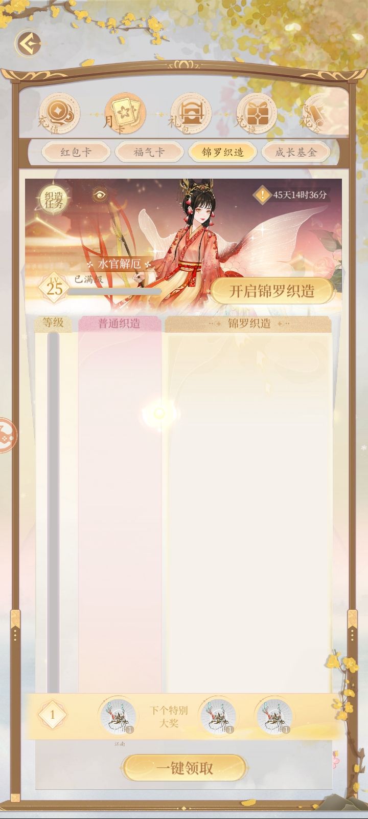 安卓兰若梦境已经领取的奖励显示未领取织造上方背景显示是水官解厄,奖励显示的是常驻典藏套装的头饰游戏名称:璇昭#万世镜