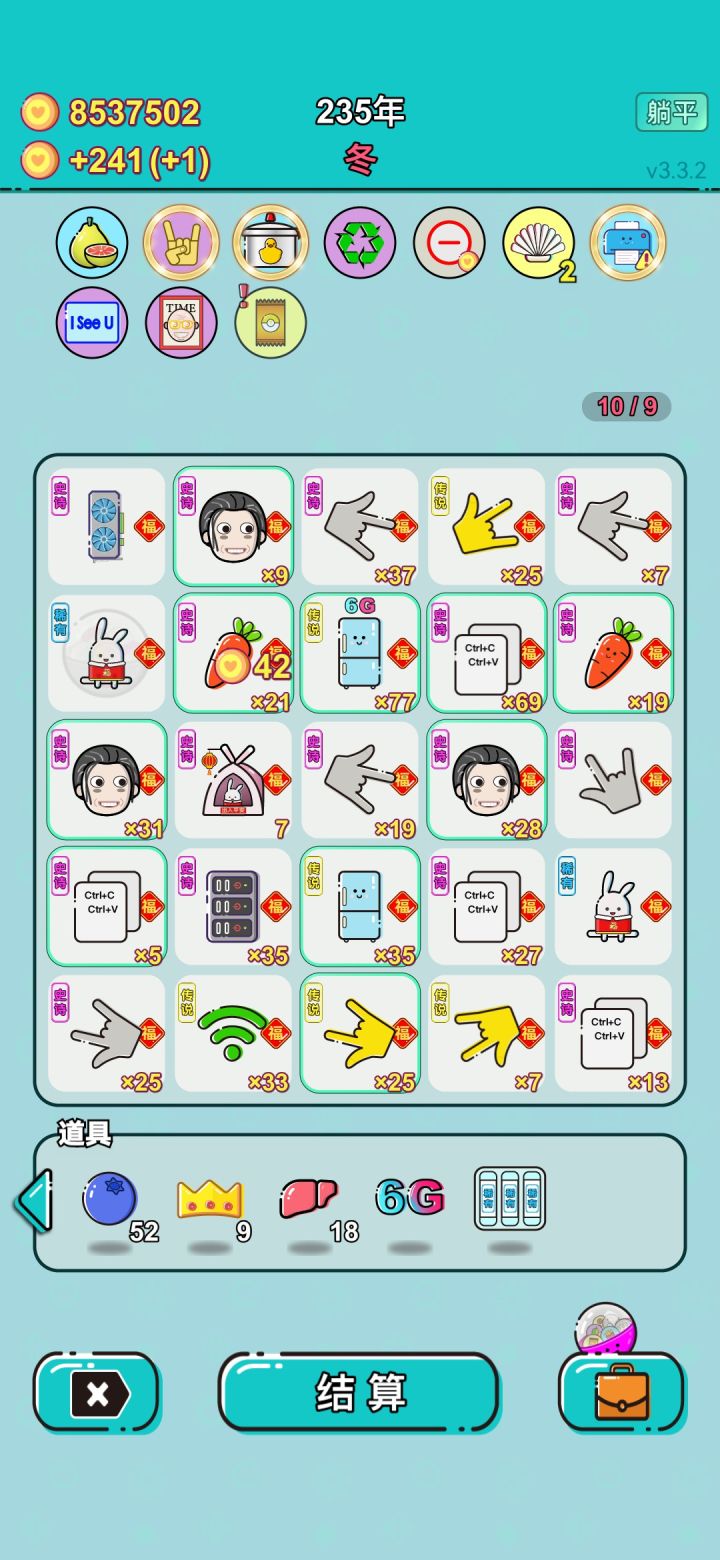 #单机游戏 #游戏推荐 我打工坚持了235年。获得第49名!共获得10596361收益。累计获得209个传说棋子。共选择1220个棋子,消除5938个棋子。我最爱undefined,选择了54次。获得了27个成就!