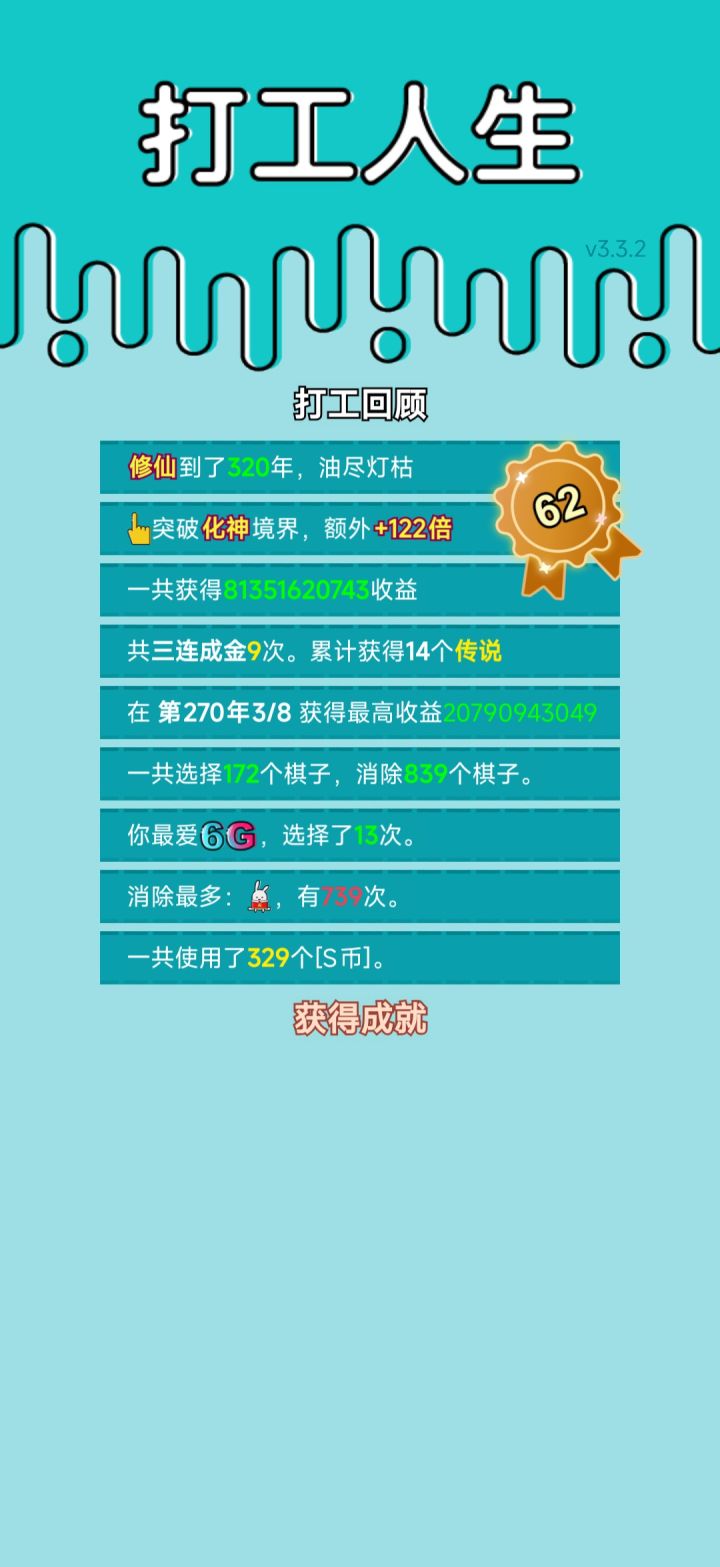 我打工坚持了320年。共获得81351620743收益。累计获得14个传说棋子。共选择172个棋子,消除839个棋子。#单机游戏 #游戏推荐