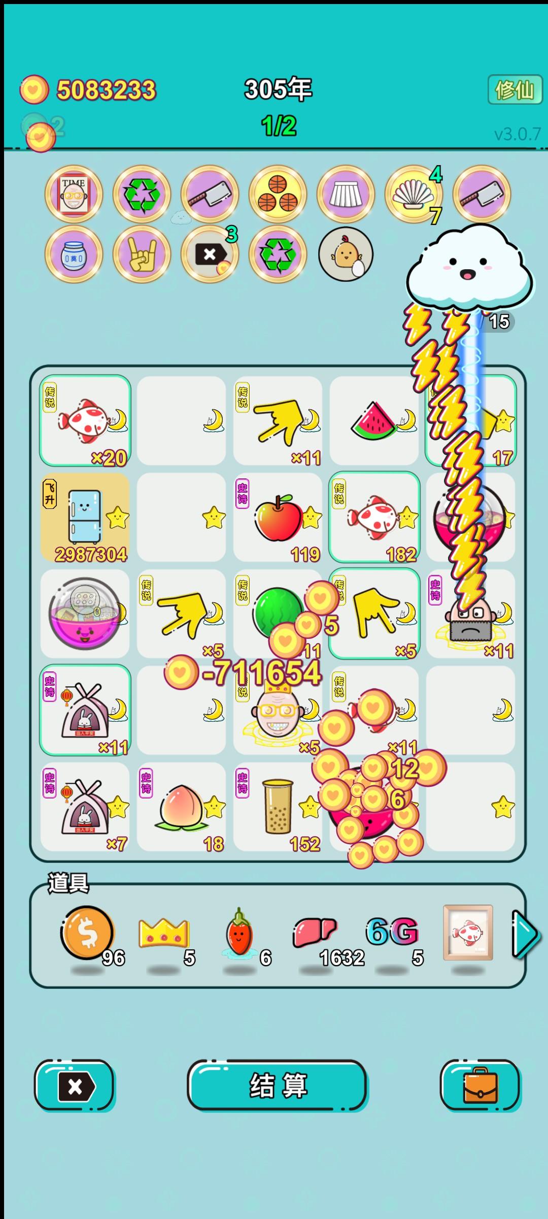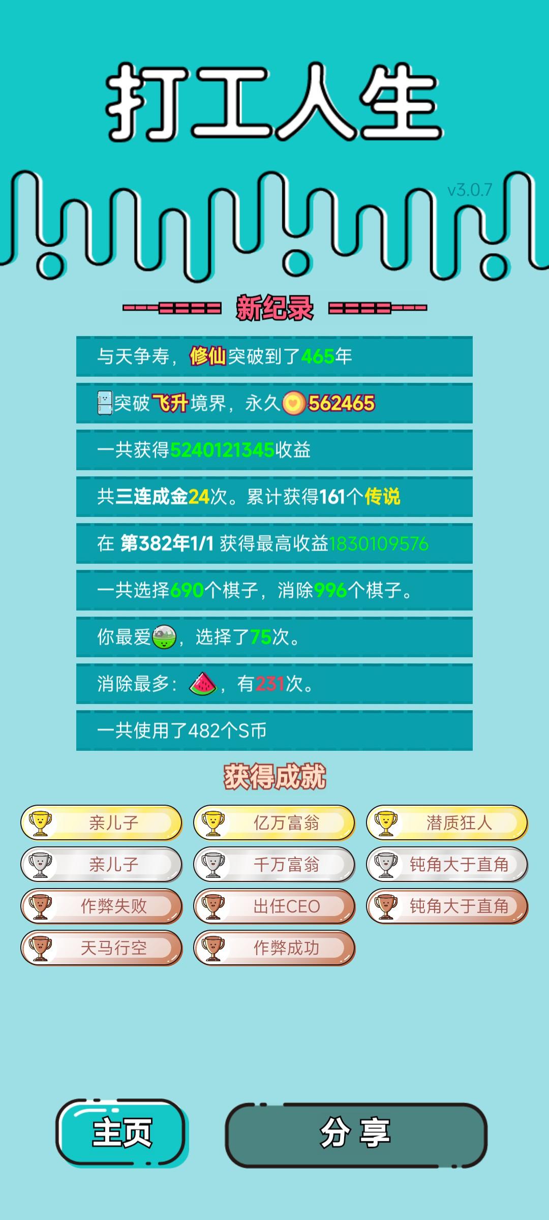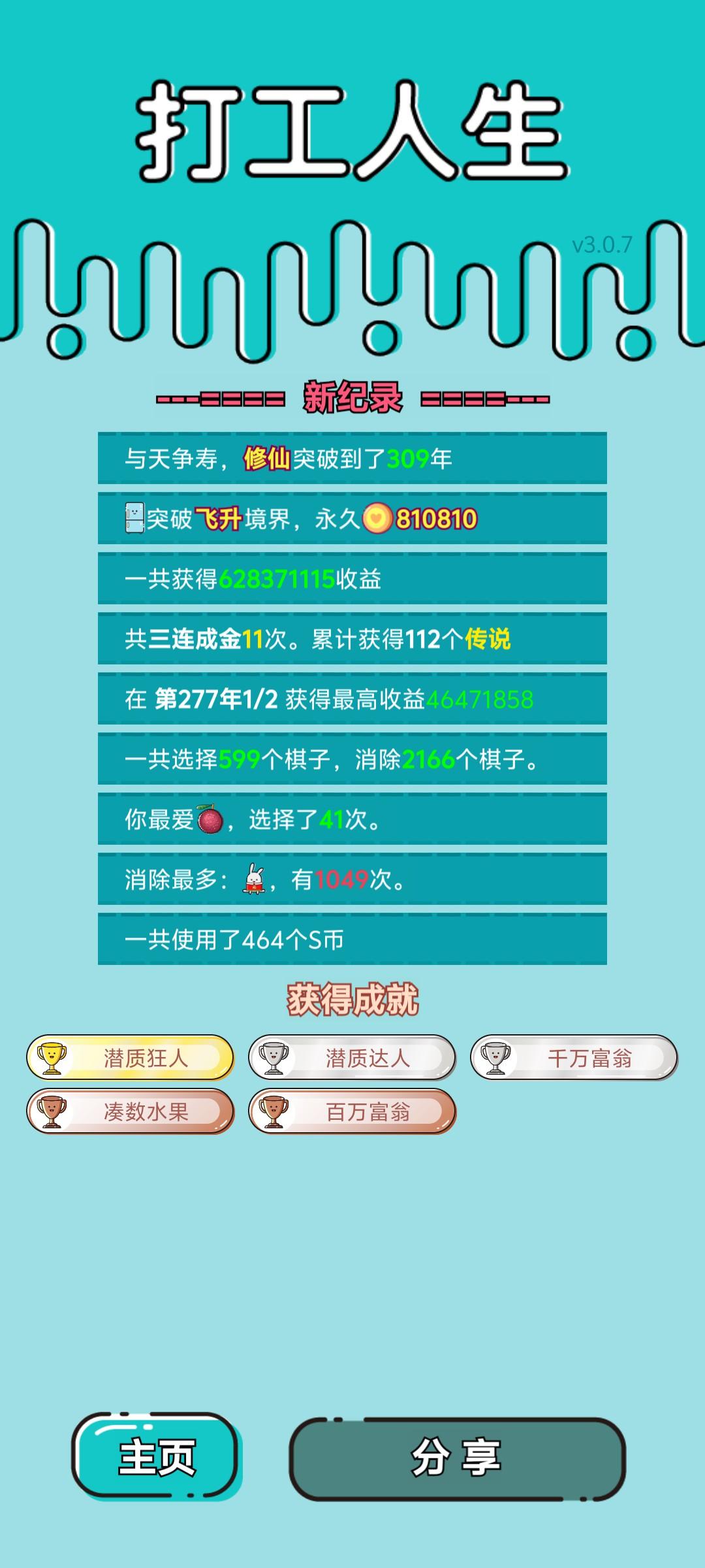 我打工坚持了309年。共获得628371115收益。累计获得112个传说棋子。共选择599个棋子,消除2166个棋子。我最爱杨梅,选择了41次。获得了5个成就!#单机游戏 #游戏推荐