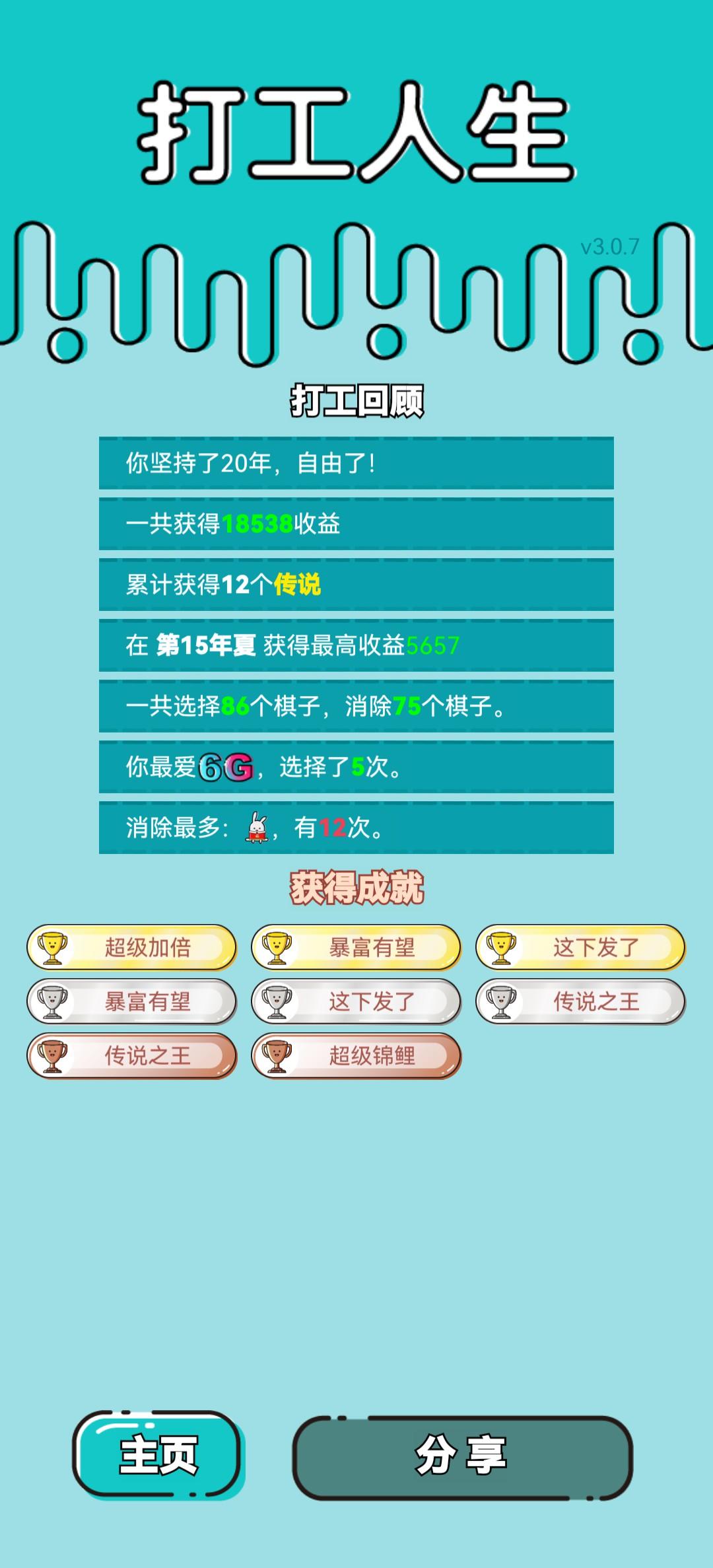 我打工坚持了46年。共获得1235888204收益。累计获得11个传说棋子。共选择150个棋子,消除298个棋子。获得了11个成就!#单机游戏 #游戏推荐
