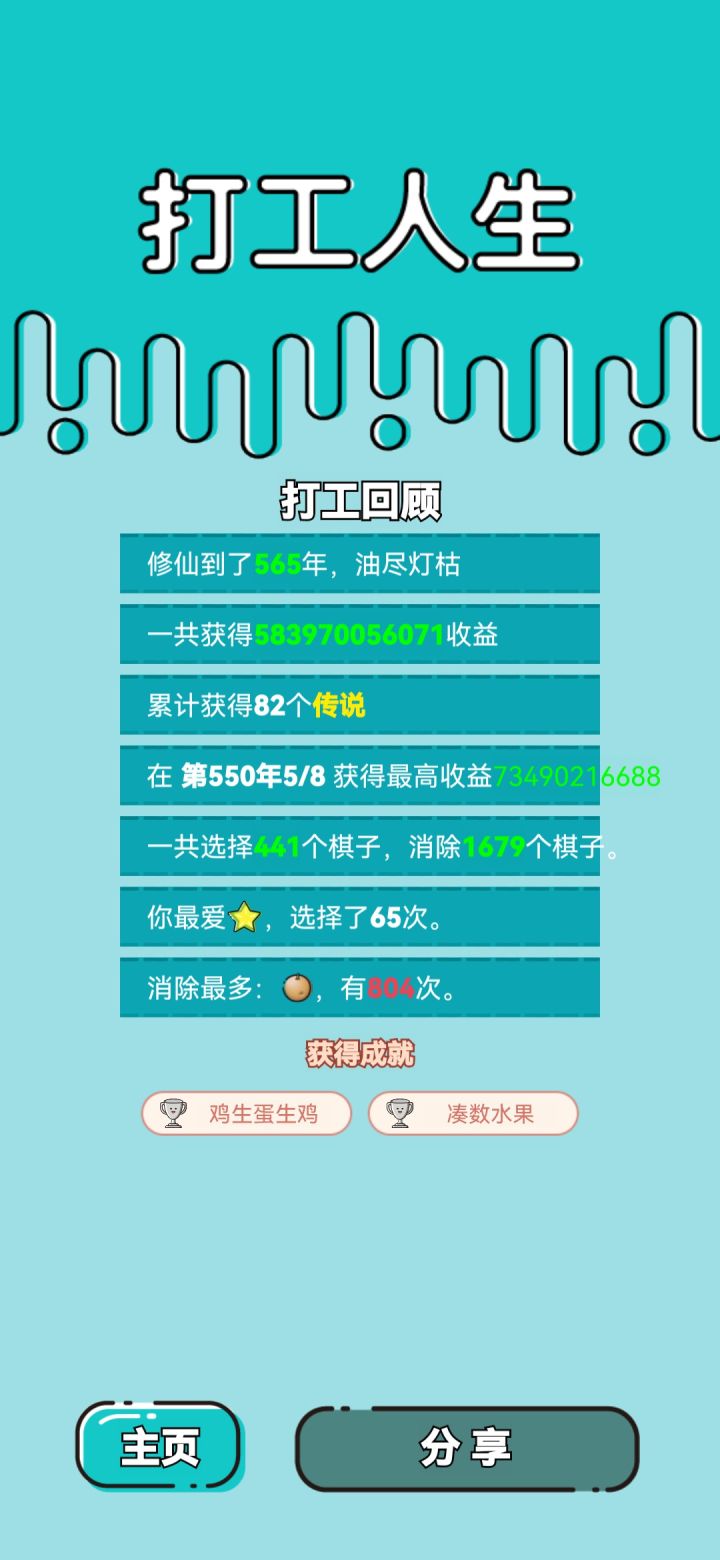 我打工坚持了565年。共获得583970056071收益。累计获得82个传说棋子。共选择441个棋子,消除1679个棋子。我最爱杨桃,选择了65次。获得了2个成就!#单机游戏#游戏推荐