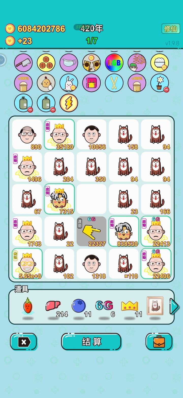 之前说过的布局:老板拿鬼的钱,无常淘汰便宜鬼,首富翻倍最高收入,这次换了冰箱来修仙,框着西瓜复制/狼吃羊拿杨桃,钱很快满,肝则不太够,用到氪棋,也是框+复制作弊,冰箱一次还能喂上10个蓝莓这局输在没刷到6G,3个锦鲤概率差不多了,后面要冒险开盲盒和盒子,狼王不能无敌,早点准备6g屠夫更好,有潜质的就加冕吧,开盒期攒移除比刷新有用,天赋也可以多选抽棋子