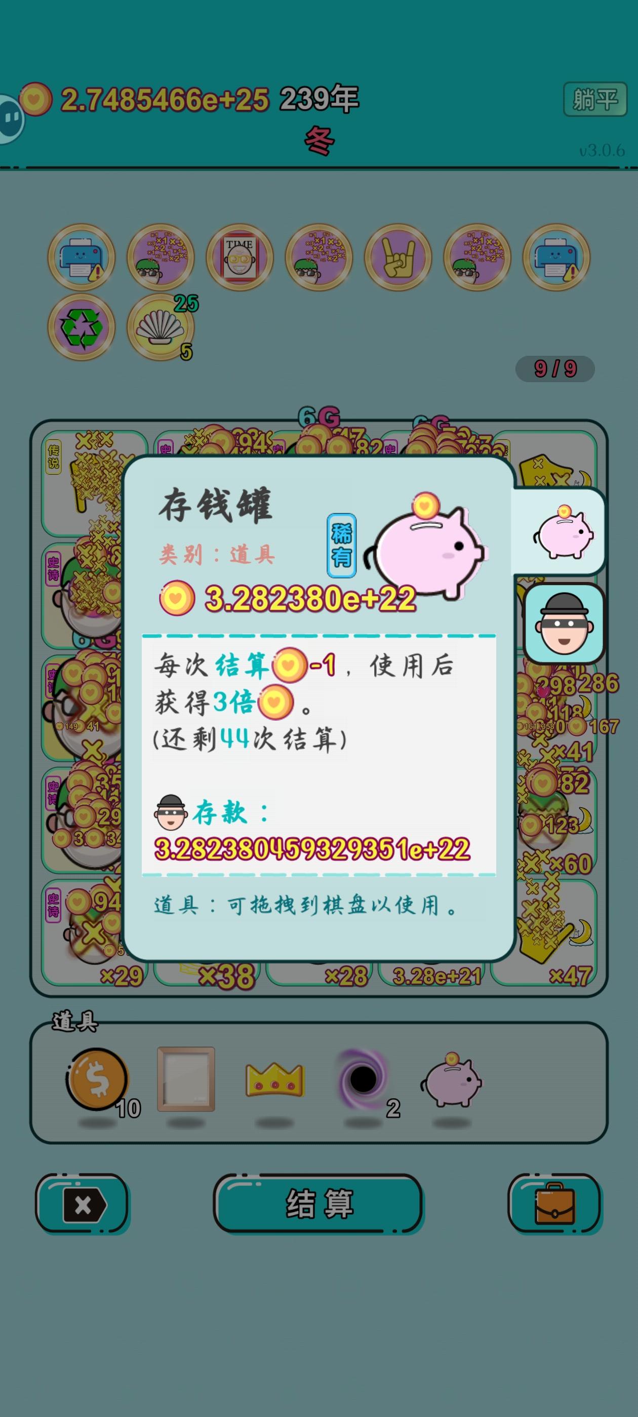 我打工坚持了228年。共获得65320560收益。累计获得57个传说棋子。共选择501个棋子,消除1129个棋子。我最爱杨桃,选择了38次。获得了22个成就!建议加强冰箱,把n改为无上限,后期的冰箱太无力了 •͈ ₃ •͈ #单机游戏 #游戏推荐