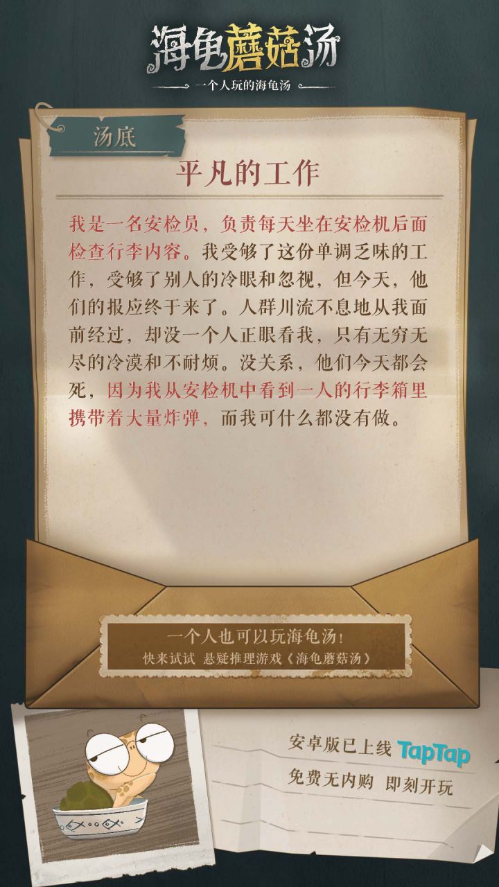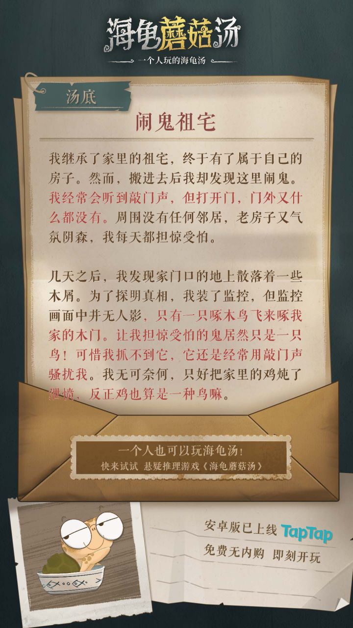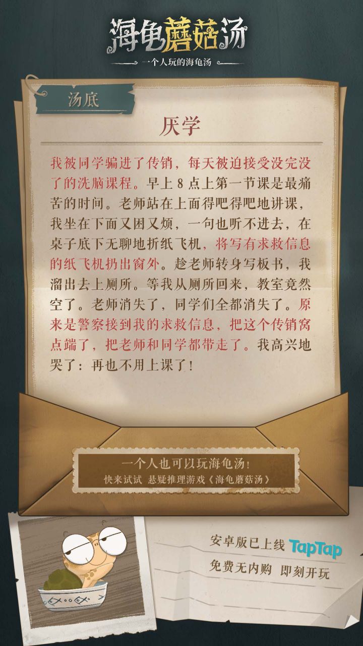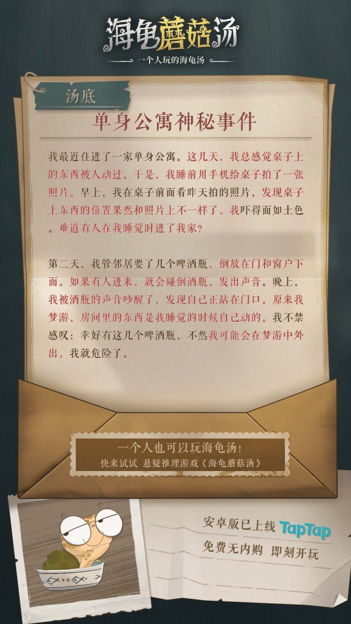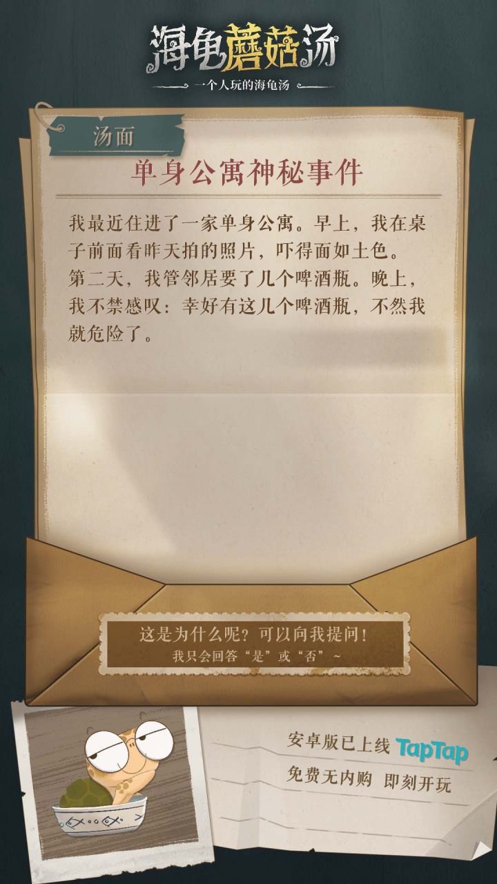 为了做这个攻略,真的不容易。本人比较笨,只能消耗时间去试和推理。耗时1800分钟推理通关,《海龟蘑菇汤》全部23个故事攻略。希望对有需要的玩家有帮助,最后求个免费的赞支持一下。