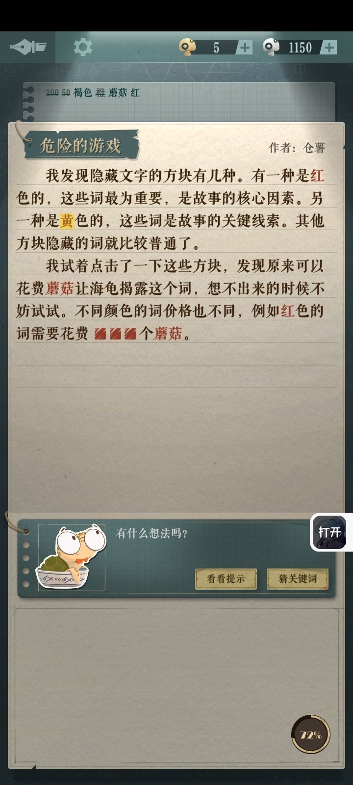 故事情节简单合理,但隐藏信息的选择非常巧妙,使得谜面看起来十分离奇,这也让游戏有了一定的挑战性。2.海龟蘑菇汤有强大的猜词同义词系统,大大减少了只扣一个词,需要盲猜作者想法的情况发生。3.现阶段没有广告,游戏体验很好。