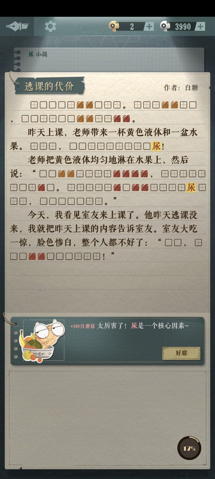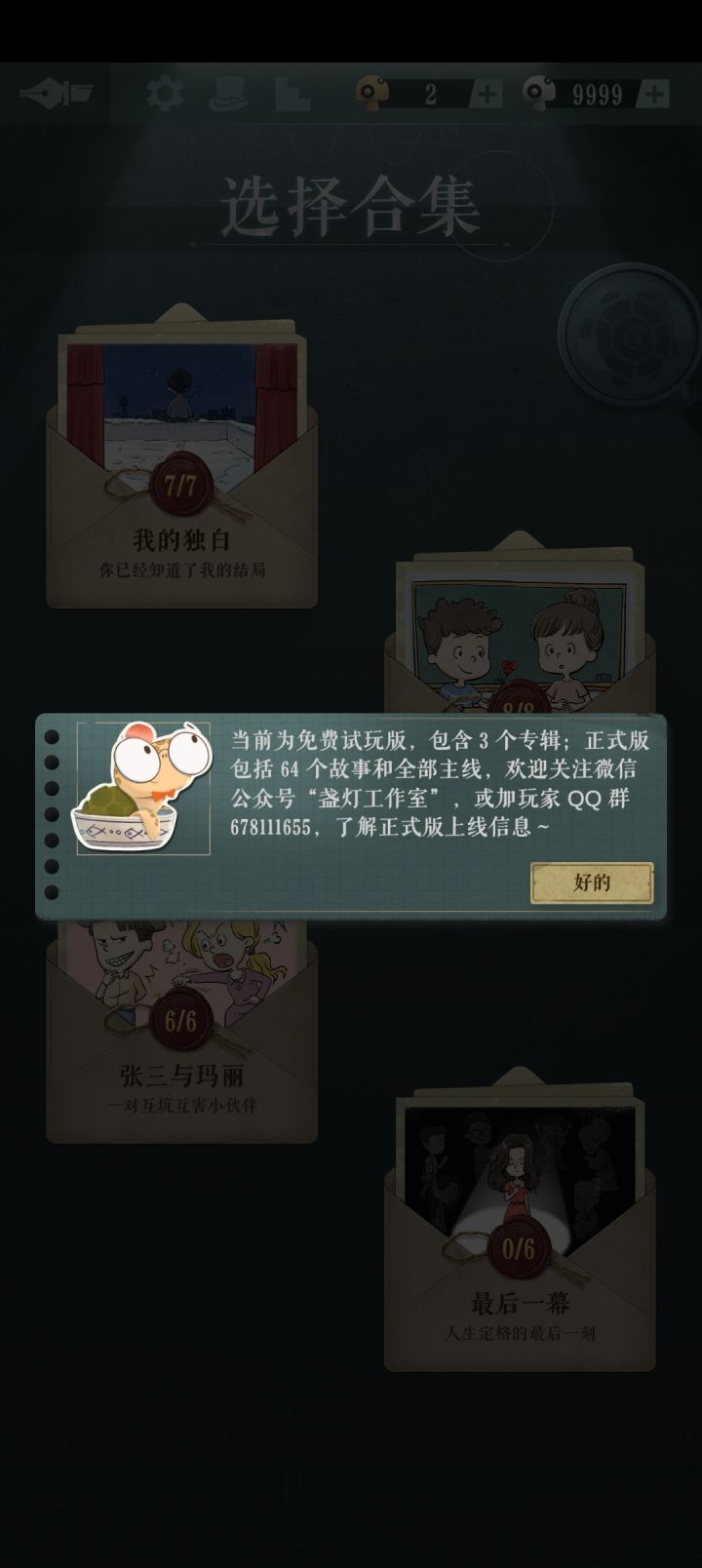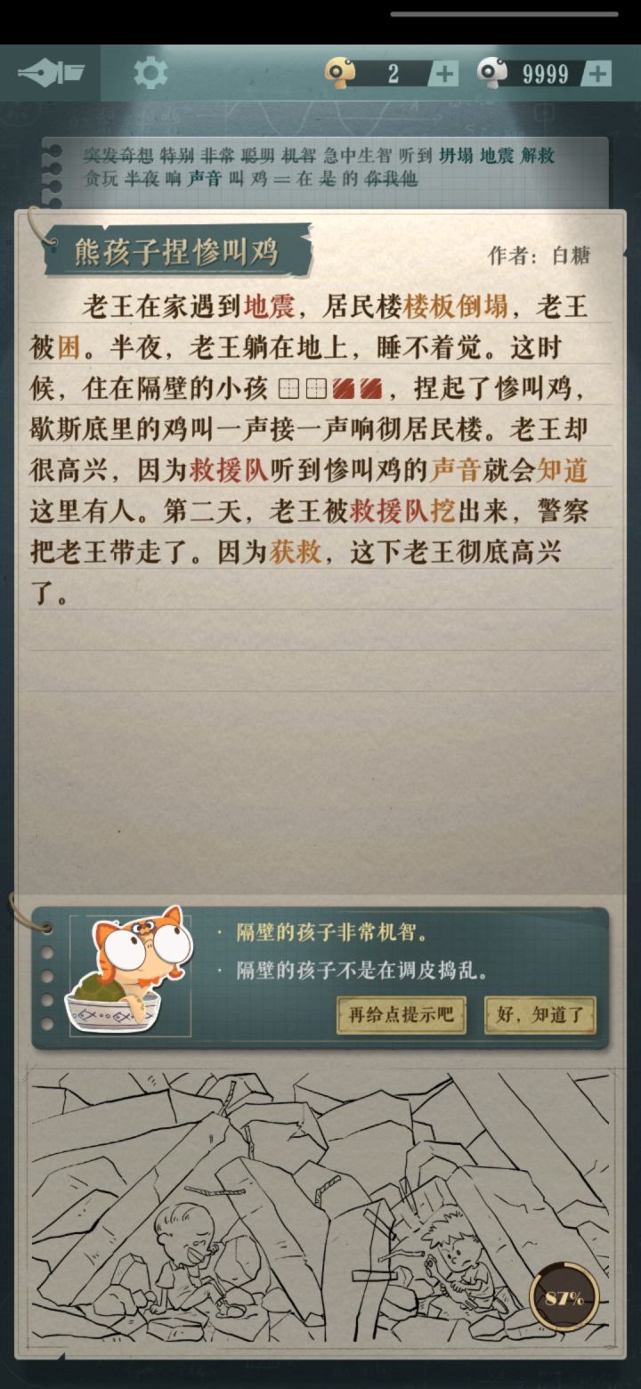 用时:一下午体验:可以卡一些常用字词推出大意,然后猜关键词。有个地下不知道怎么玩,拿了给道具也看不全,估计是正式版才能解密。部分故事挺有趣,个别无聊,总体挺好玩。