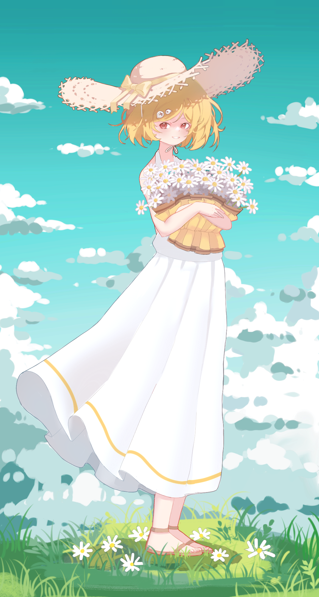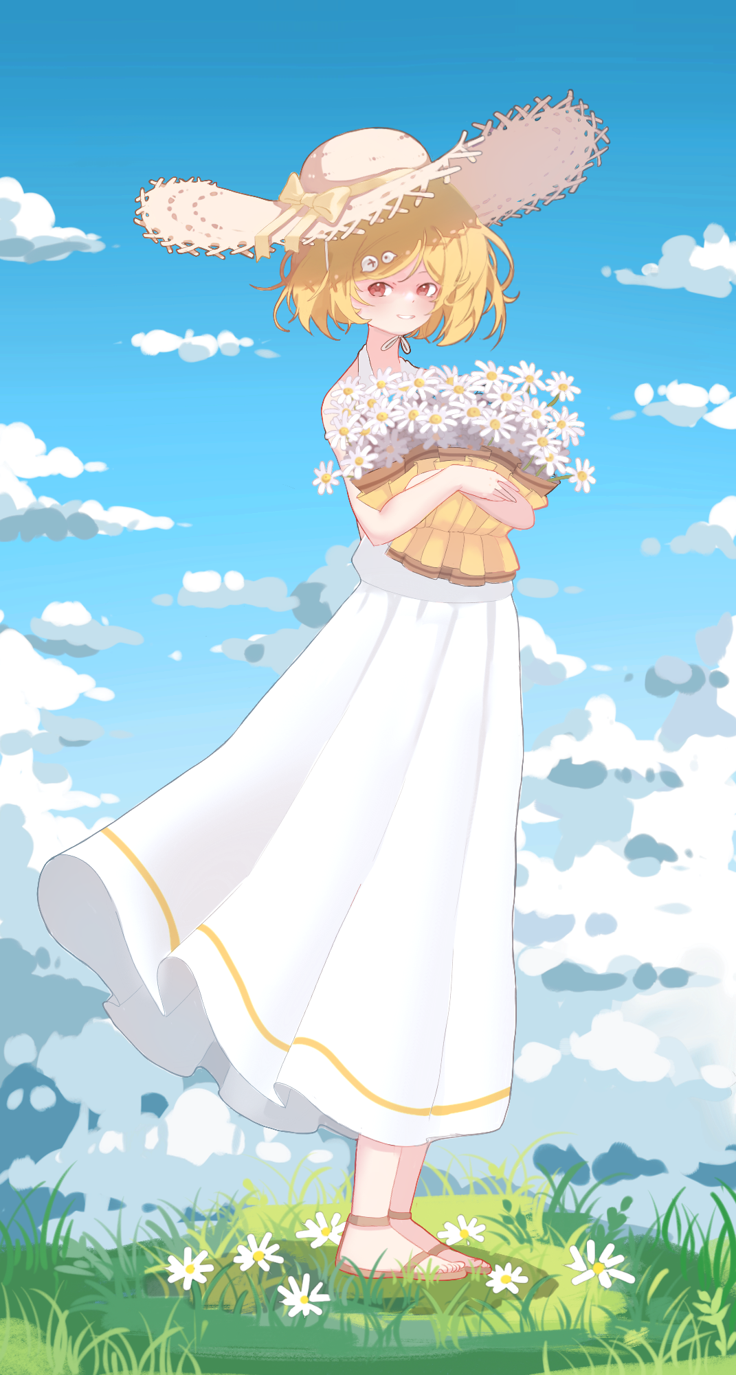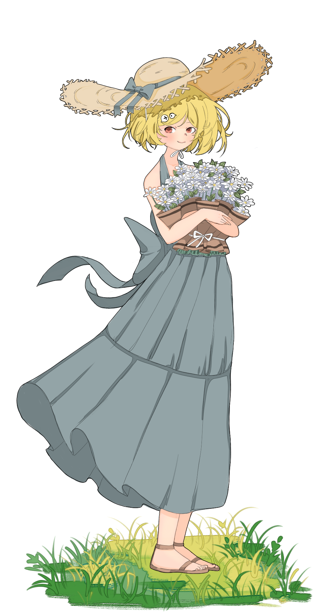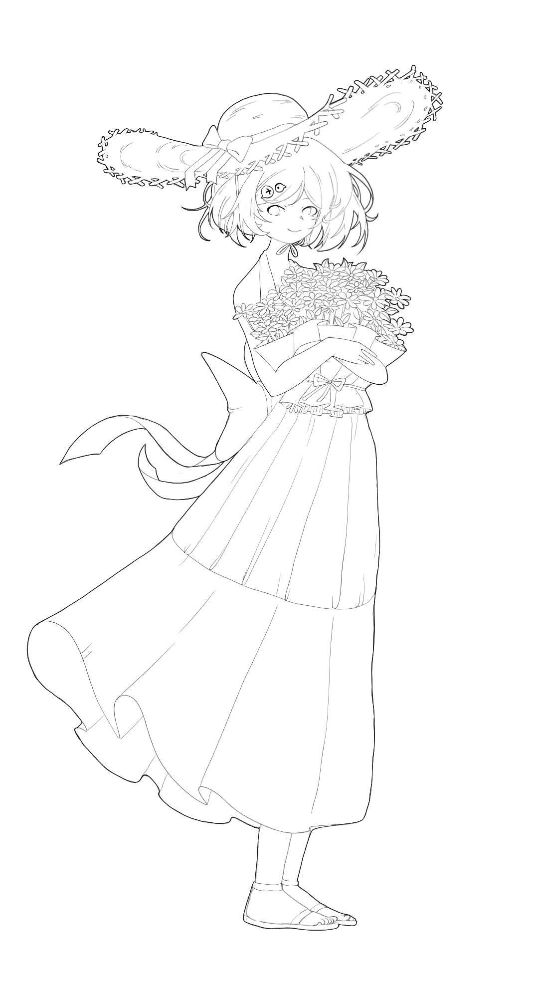 描述:夏日凉风中的小爆妹手捧一捧小雏菊站在草地里微笑,风中都带着一丝甜甜的味道。PS:由于本人不擅长上色所以附上线稿供大家自由发挥哈哈,想法总是比画出来的美好,本来想画站在玉米地里奈何技术有限#盲盒派对 #盲盒派对爆米花创意大赛