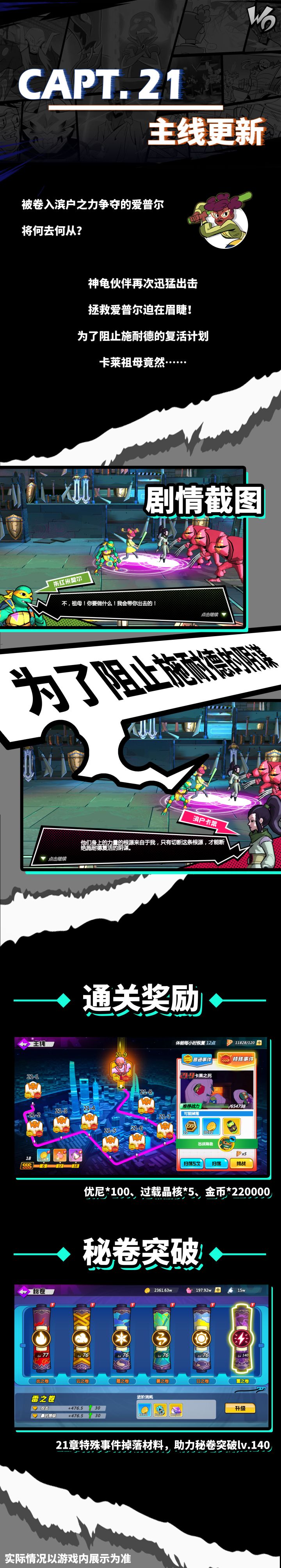 神龟伙伴再次迅猛出击,拯救爱普尔迫在眉睫!第二十一章主线更新,内容请看! 游戏将于2月22日8点进行更新,届时各位忍者们就可以体验到主线21章的全部内容啦!(角色等级需达到62级)与此同时,我们还修复了暗区6-3有概率卡住的bug。敬请期待~============================官方交流群一览:欢迎大家来玩!官方交流QQ群:622677668官方交流微信群:微信