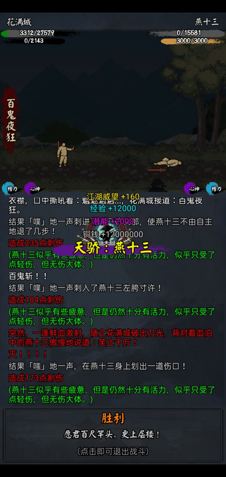 大约啥时候能来一次大更新,燕13杀6次了一直不给奇遇这bug很难受,第一次杀只给了天骄没给奇遇,之后子时去谢晓峰那块也没有剧情,完了燕十三就诈尸了要重新挑战,挑战死了依旧没有,我本来也不是多厉害,打死一次也怪费劲的,每次都要逃跑回血,有的时候还会卡死就要退了重新上,我也不知道是不是重新上的缘故,总之快改吧,热情快被磨没了。