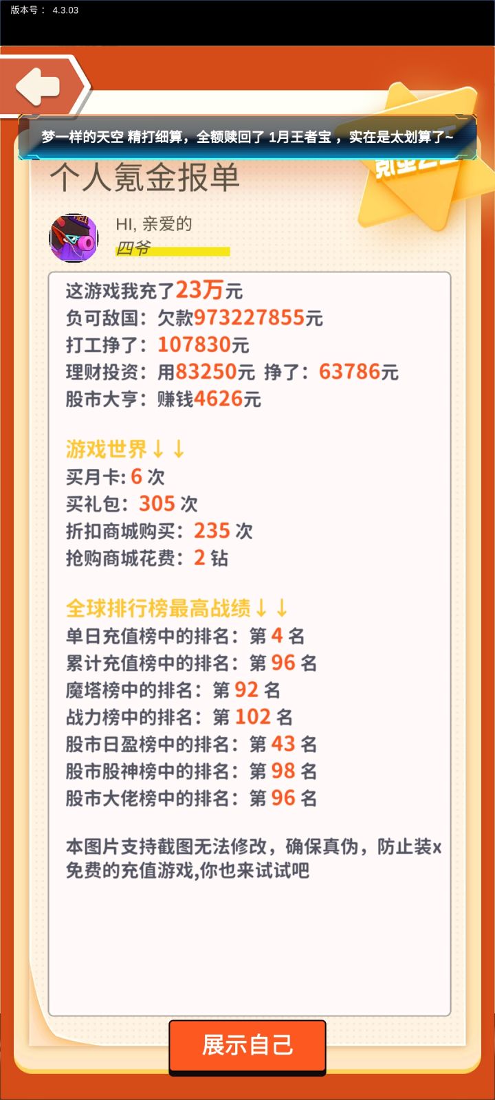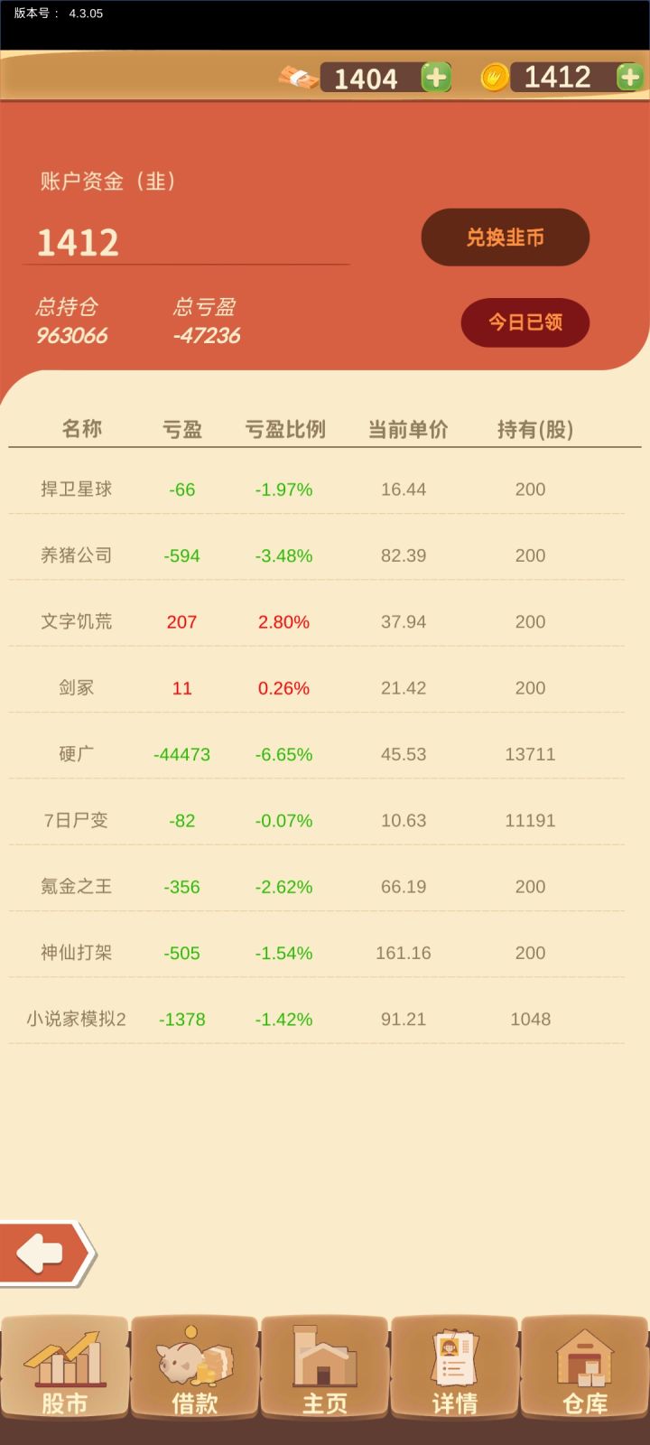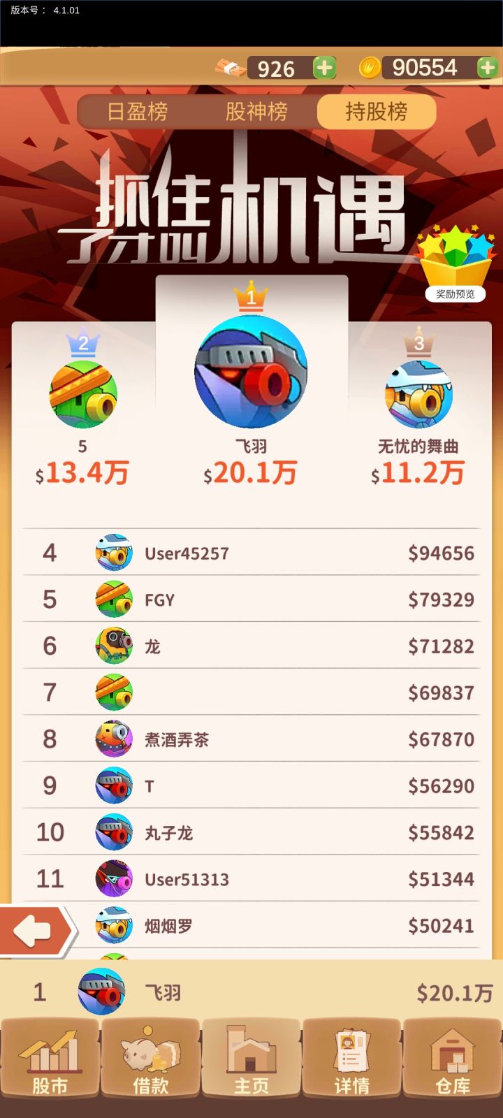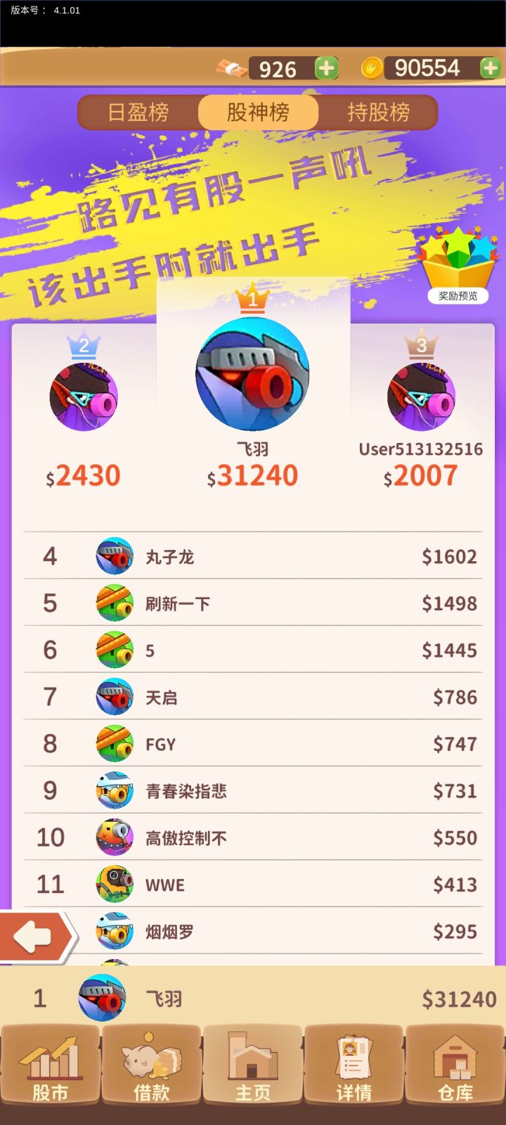 玩了些感悟。1.游戏的终点绝对是股市 他可以无上限的让你的资金百分比增长。建议开局直接各种贷款搞钱进股市。2.最好解锁贷款的方式是战令经验,我现在第三天已经两千二经验了。3.虚拟战力建立在实体经济之上,不要着急游戏内氪金。把每种基金的王者宝拉满。已知股市每天领取4444韭币分红,同时每只股票持手中闭市之后会额外送你100股。建议每只股票都挑负的三四个点的时候买入一些。