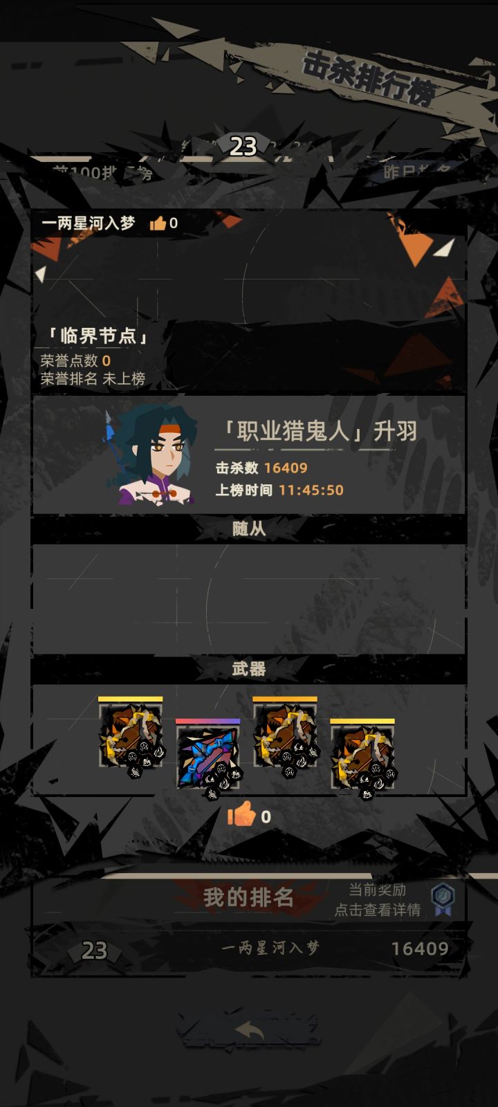 这是我(菜狗)玩的第四天,无随从狂野模式击杀上榜(第一次上榜),虽然我感觉等结算的时候会掉下去不过也很高兴!发个帖子纪念一下!