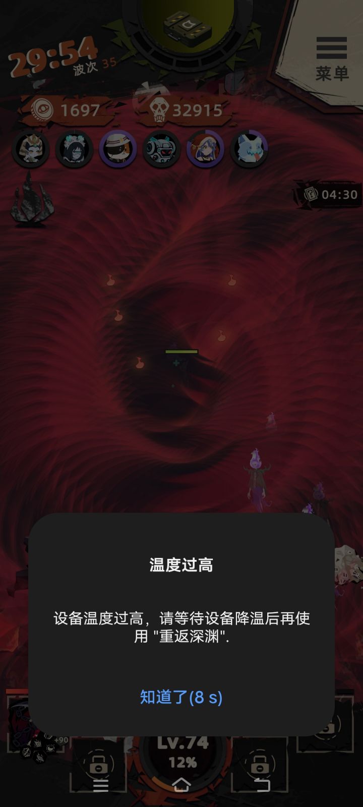 我手机打原神,王者,逆水寒都不会提示温度过高,我打个无尽叠了70层buff,打了不到10分钟给我提示温度过高强制退了。开省电都没用。