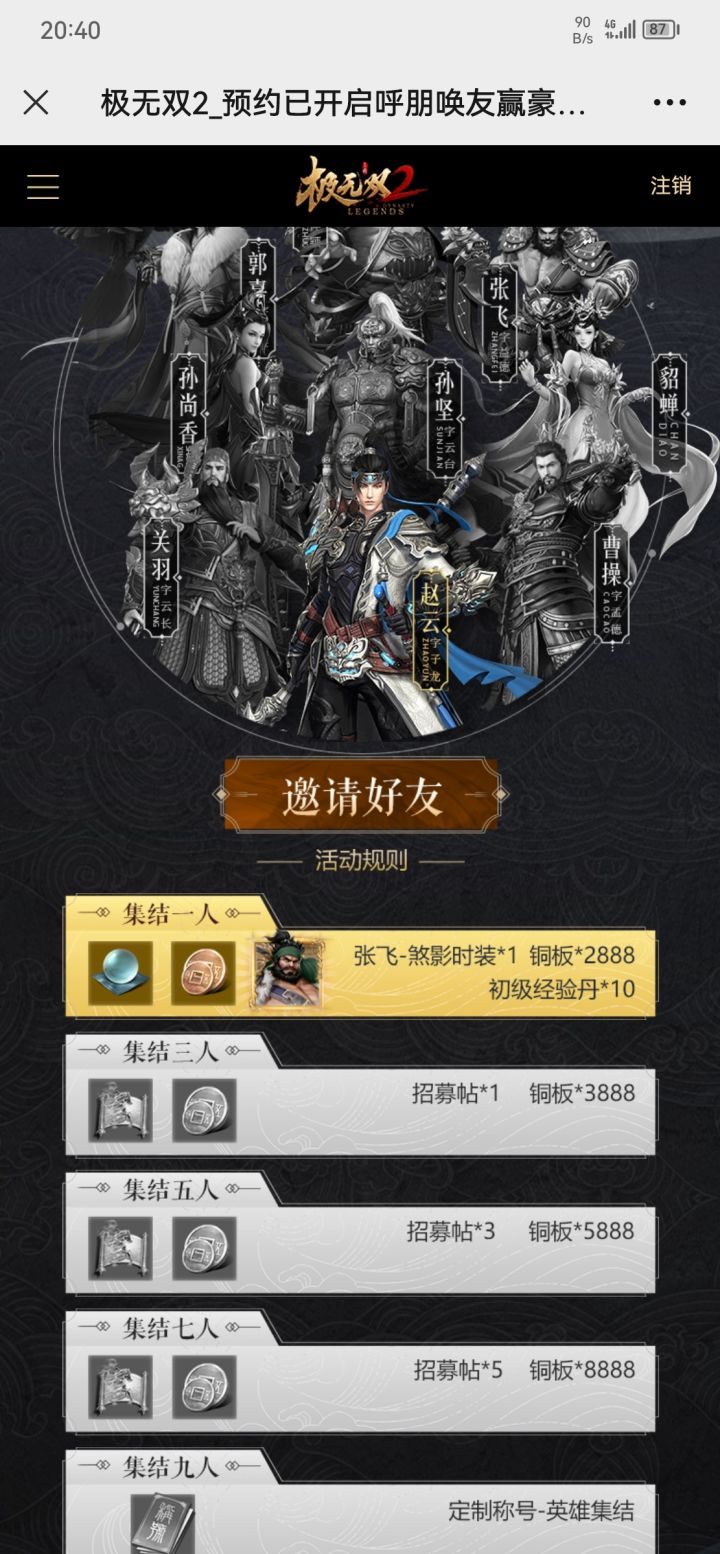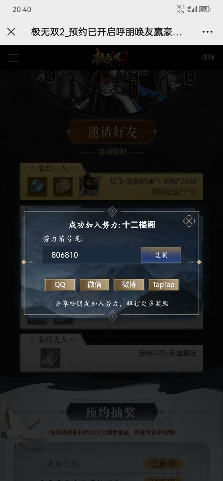 还差三人我成功预约了【极无双2】,并加入了无双势力:『我家宝宝』势力暗号是:『643447』复制势力暗号并打开网页:https://jws2.yingxiong.com/m/?team_code=5C6572?team_code=643447,即可和我一起加入无双势力!天下名将,极者无双!